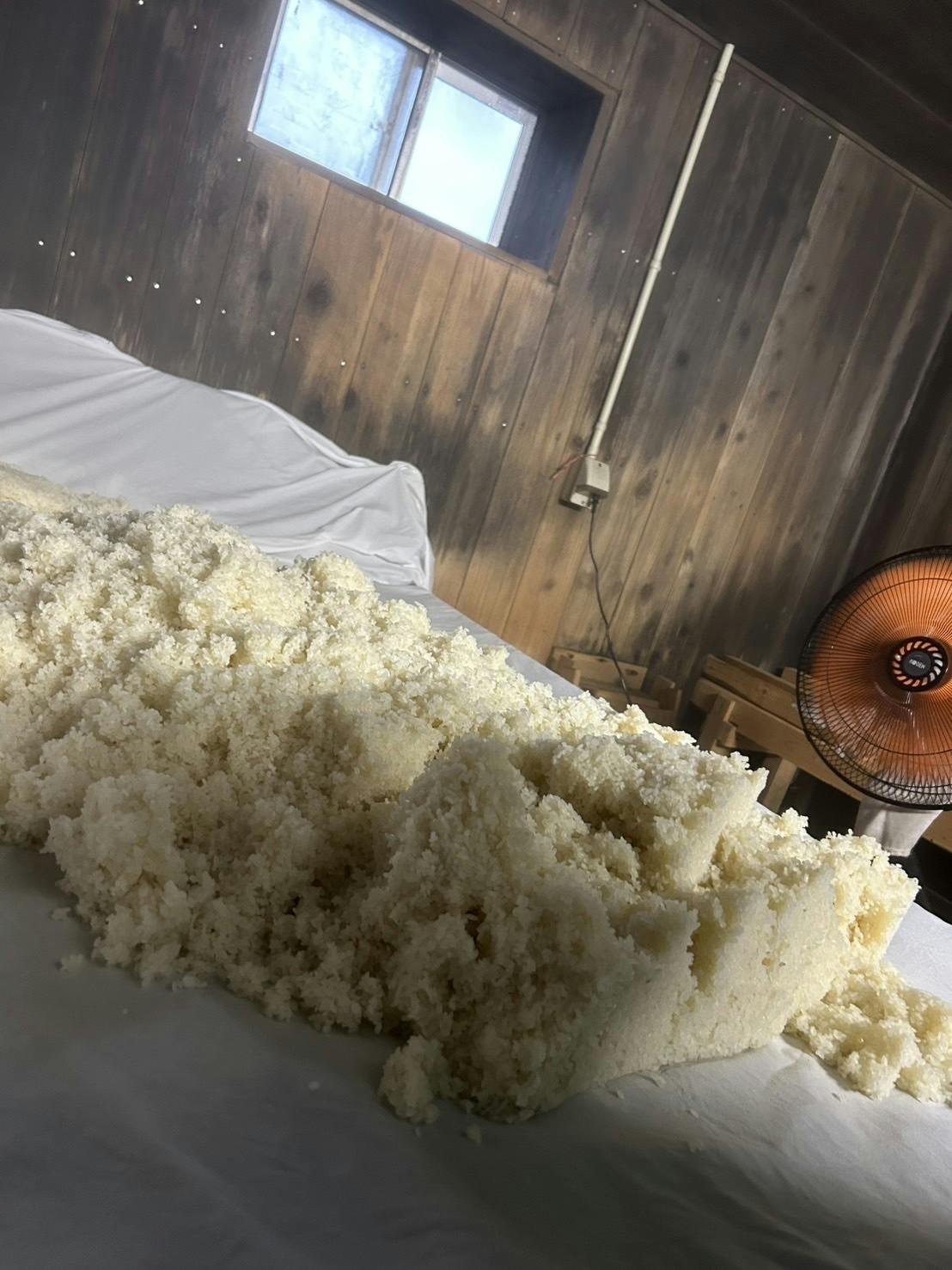 そして今朝、麹菌(種麹)を丁寧に振りかけました。ここからは、3時間おきに手入れをしながら、室の中で麹菌をじっくり育てていきます。