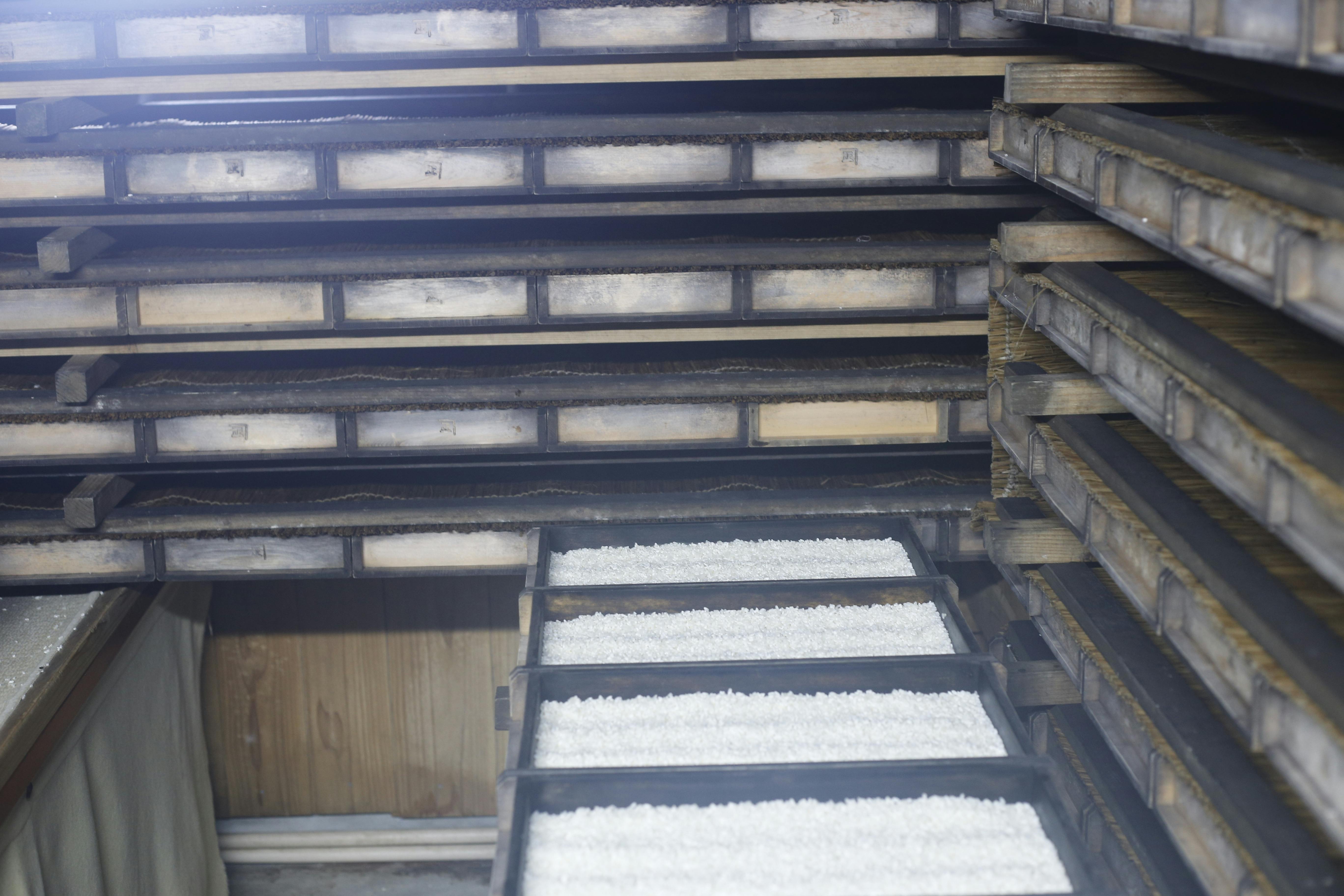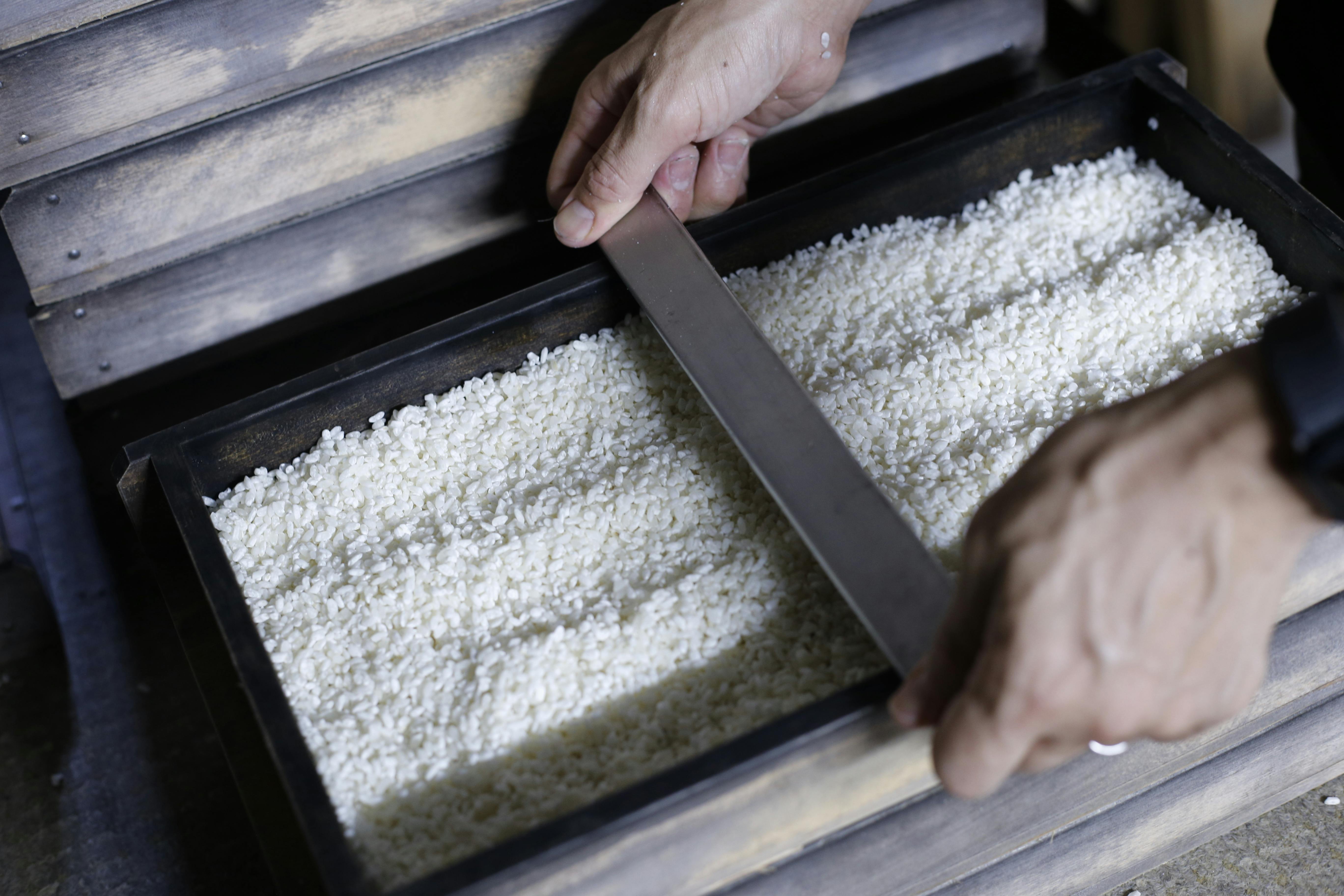 一昨日仕込んだ蒸し米に麹菌をふりかけてから、温度・湿度を管理された「麹室(こうじむろ)」でじっくり発酵が進んでいます。