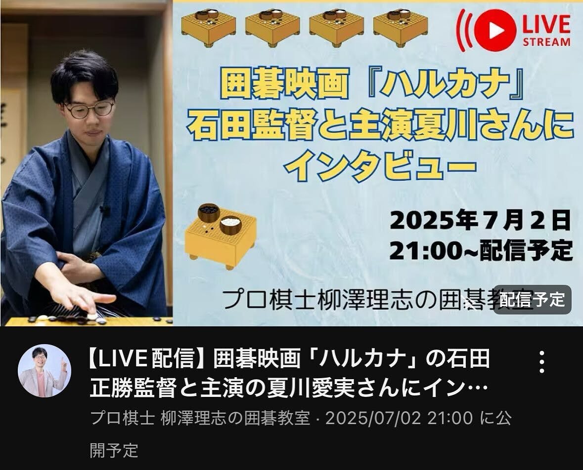 本日、監督の石田が、№1囲碁ユーチューブチャンネル『プロ棋士柳澤理志の囲碁教室』に出演します!