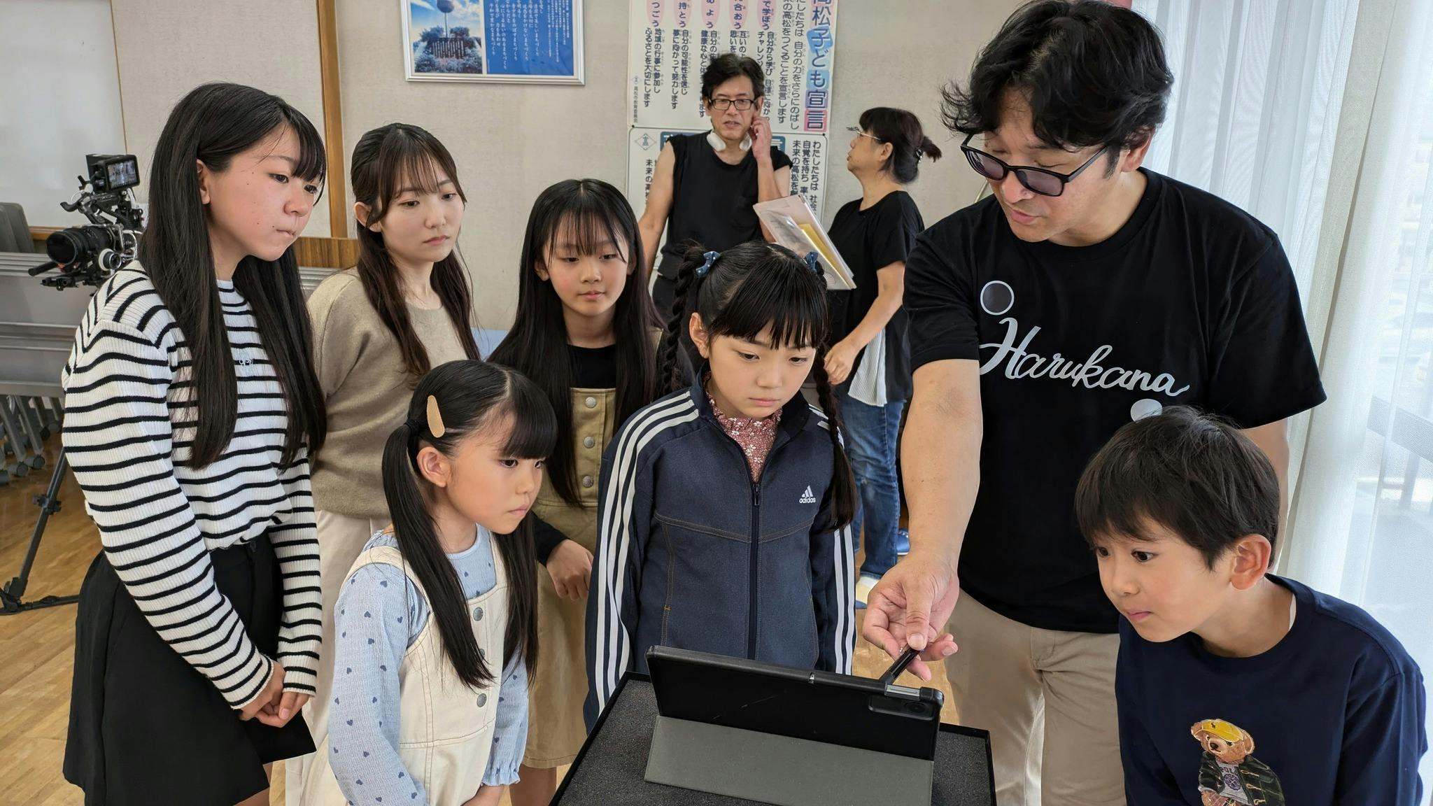 春斗役の赤井智哉さんと教室の生徒役、菜衣役林海結ちゃん、菜乃役内田心海ちゃん、優乃役森下珠妃ちゃん。