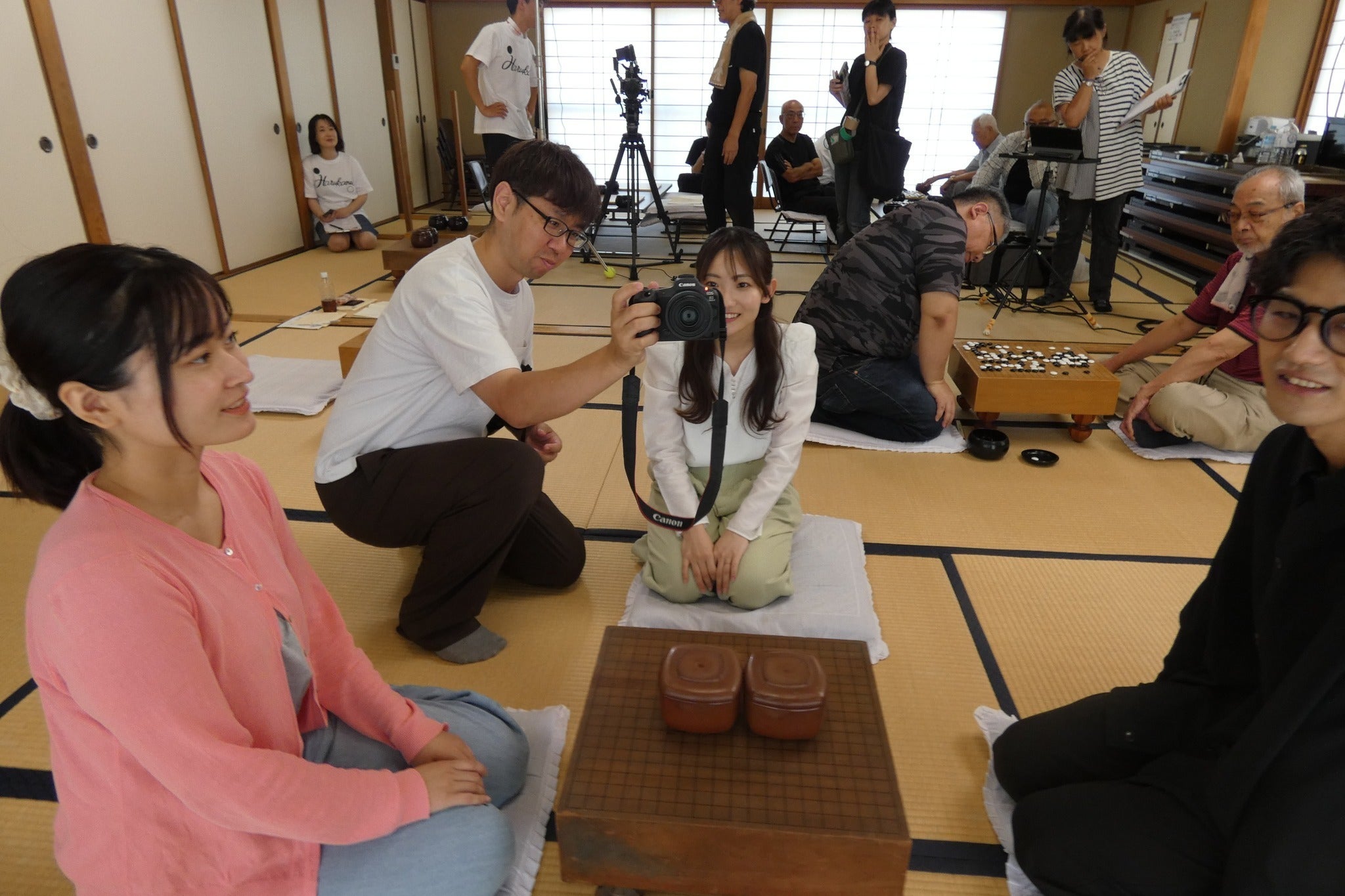 キャストスタッフ陣がハルカナTシャツを着て記念撮影をしてるところを、夏川愛実監督はすかさず演出します。さすがです。昭和感ばっちりの戦隊ものですね!左から、広報スチール担当SNS担当(公式さん)の岡尾さん!左から2番目、田中良子役、劇団SANBABAの結めぐみさん!中央、安藤春斗役、赤井智哉さん!その左、しっかり歌舞伎の松原信子役、劇団SANBABAの中越恵美さん!無理やり参加させられた、音声担当の上村さん!素晴らしいハルカナ戦隊囲碁レンジャーが黒でそろいました!次回は、白でそろえて撮りますか☆