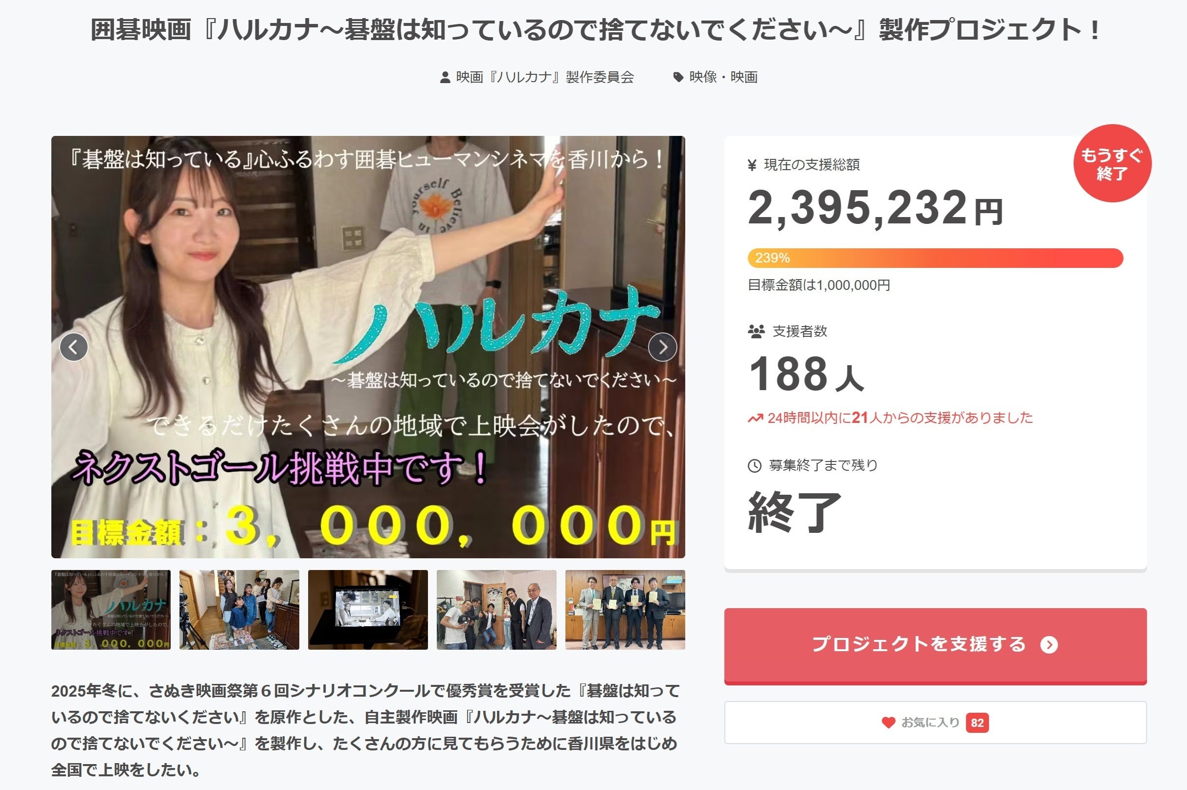 拝啓 時下ますますご清祥のこととお慶び申し上げます。映画『ハルカナ~碁盤は知っているので捨てないでください~』のクラウドファンディングにつきまして、令和7年8月31日をもちまして無事終了いたしました。おかげさまで、ご支援総額2,395,232円、支援者数188名 という大きな成果を得ることができました。これはひとえに皆さまから寄せられた温かいご支援と応援の賜物であり、製作チーム一同、心より御礼申し上げます。今後はリターンの準備を進めながら、映画完成に向けて真摯に取り組んでまいります。進捗につきましては随時ご報告いたしますので、引き続き温かく見守っていただければ幸いです。敬具映画『ハルカナ』製作委員会監督 石田正勝