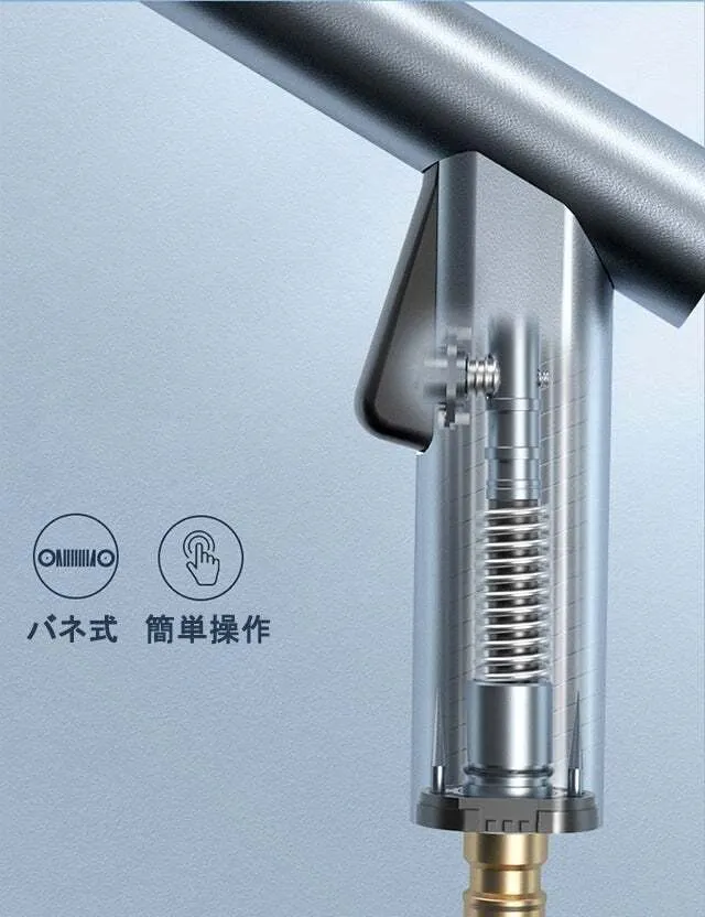 通常のレバー式と違って強く握る必要がなく、ハンドルのトリガーボタンを一回軽く押すだけで放水と止水の操作ができてとても便利です。