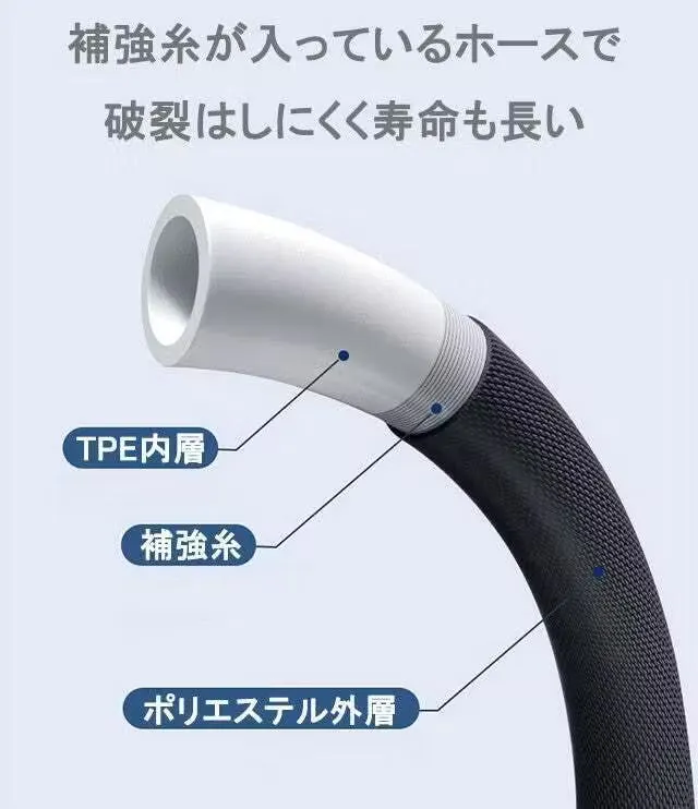 高い水圧に耐えられるようホースを多層構造に設計し、補強糸も使用しております。内側のTPE素材は劣化しにくく伸縮機能があり、さらに高強度のポリエステルを外層に採用したことでホース全体が破裂しにくく水漏れの心配もありません。