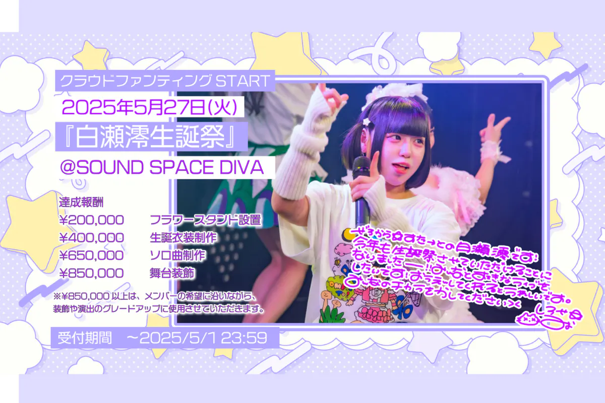2025年5月27日に名古屋SOUND SPACE DIVAで開催されるアイドル「白瀬澪」の生誕祭です。今回は、彼女の生誕祭を成功させるために、彼女を応援する全てのファンの力を集結させたいと考えています。