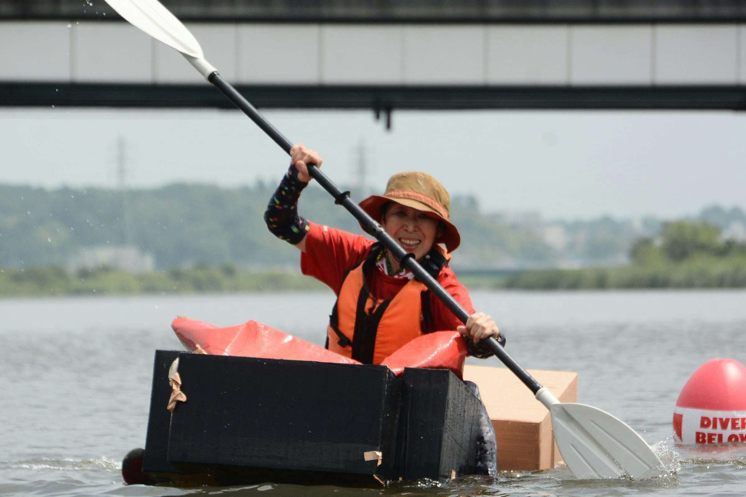 仲間や子どもたちとEボート(10人乗りの手漕ぎカヌー)を賑やかに漕いでいき、着いたら手を休めてぽっかり風まかせ。
