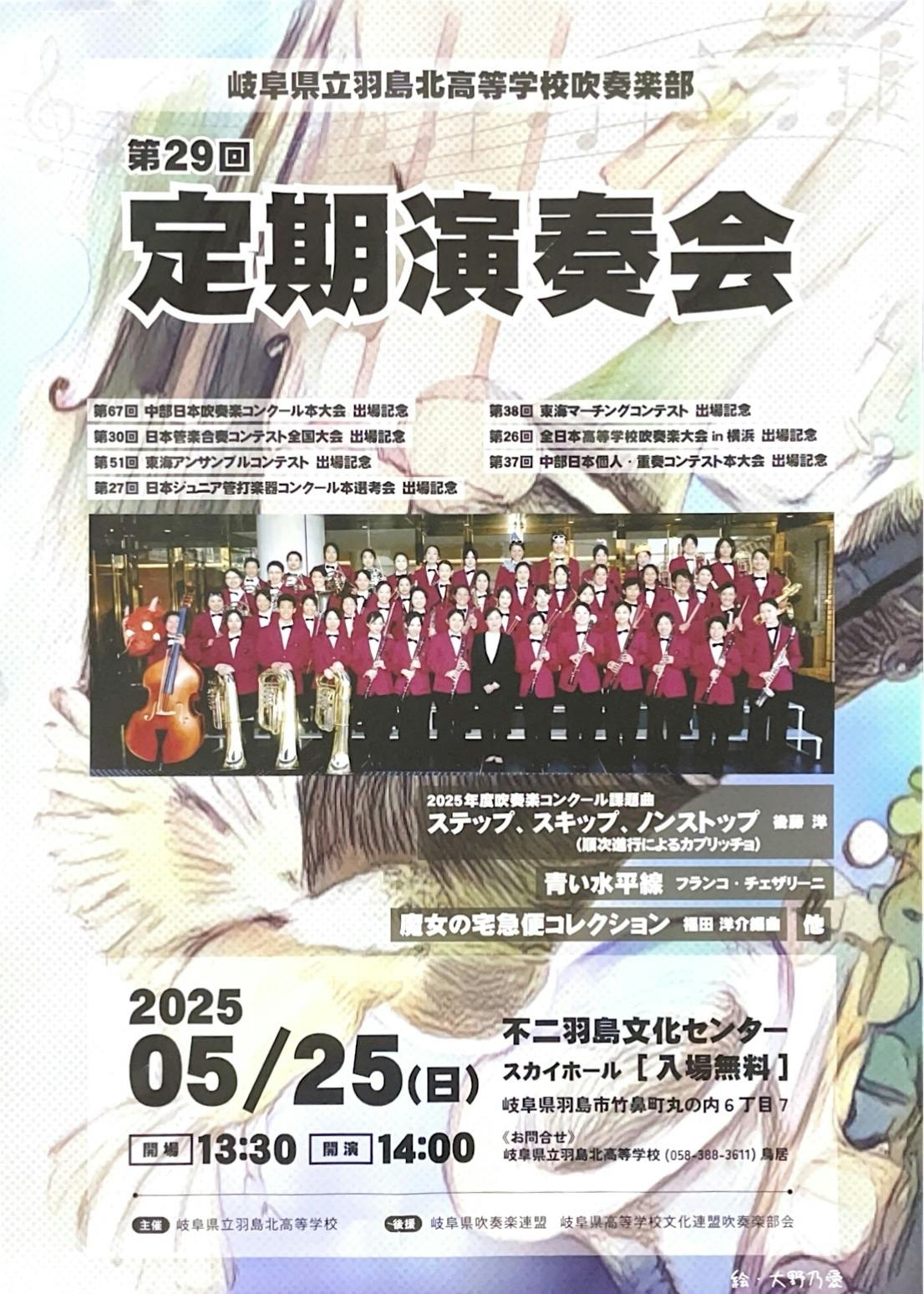 こんにちは!クラウドファンディングを始めて2日目、すでにたくさんのご支援をいただき、本当にありがとうございます。温かいメッセージに感謝の気持ちでいっぱいです。引き続き応援よろしくお願い致します。いよいよ明日開催となりました、第29回定期演奏会についてのお知らせです。場所 不二羽島文化センター開場 13:30開演 14:00入場無料です。今日は皆様に定期演奏会を楽しんでいただけるよう、リハーサルを頑張っています。ご来場を心よりお待ちしております。