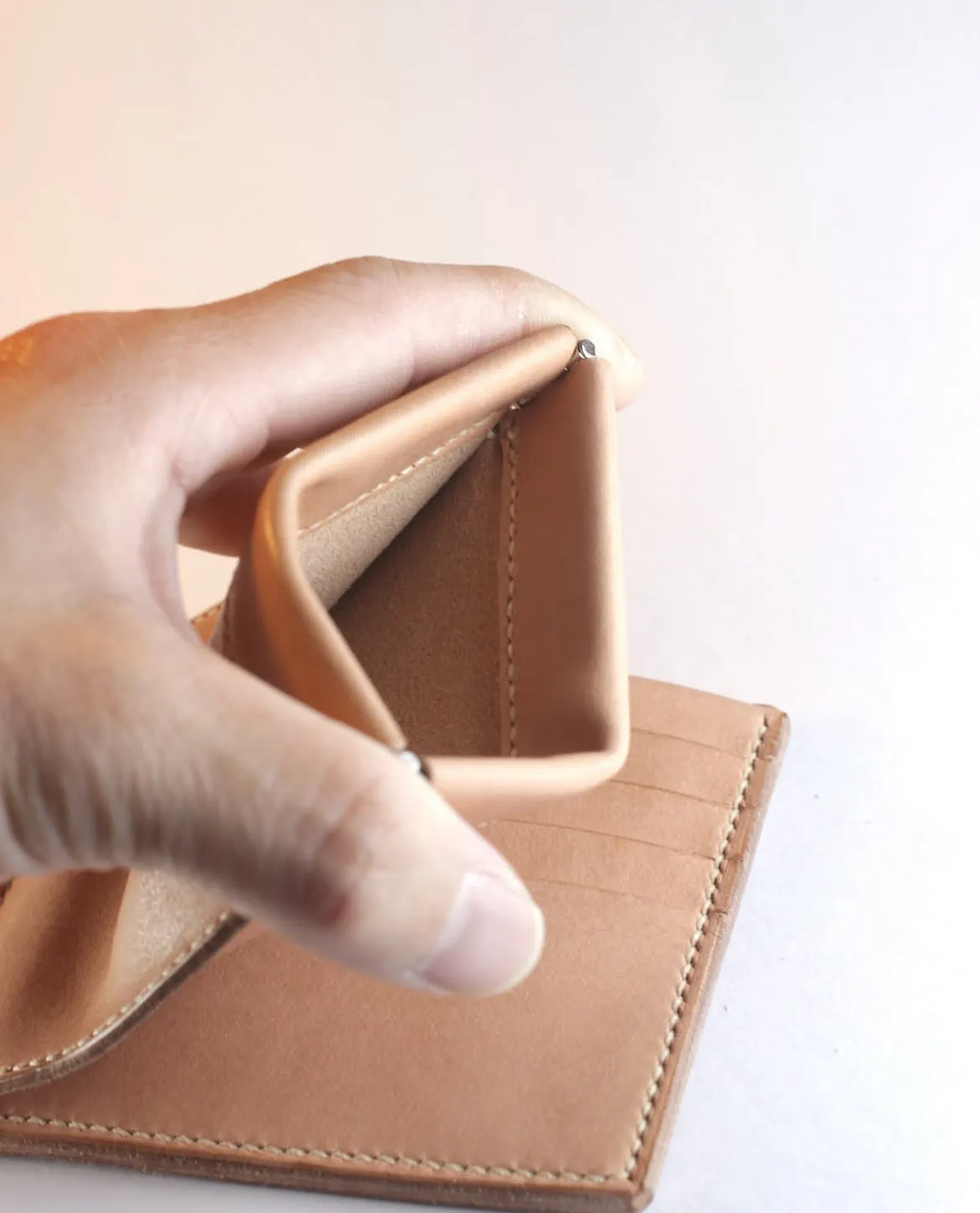 ↪︎折りたたむ内部に金具が無いようにし、レザーと金具が擦れたり、傷つく事を無くしました。
