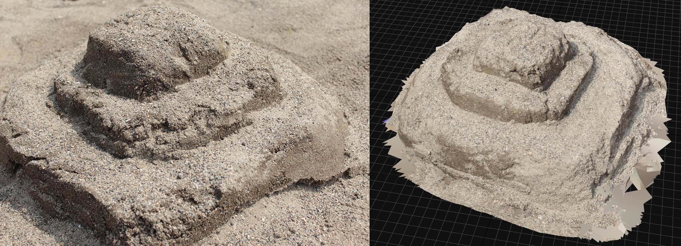 せっかくなので、おじさん二人で砂遊びして、3Dデータ化できるかを試してみました。