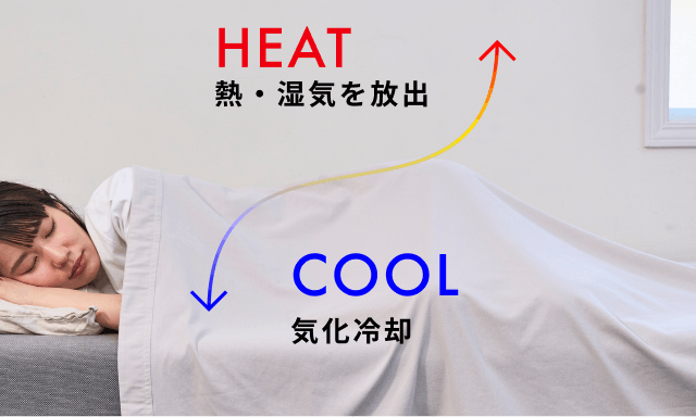 本商品は、カバロス独自の後加工で拡散水分率を高めており、汗などの水分を吸い上げて短時間で生地表面に拡散させます。この際、気化熱も生じます。上記仕組みによって、睡眠時、涼しく快適な環境を保つことができます。