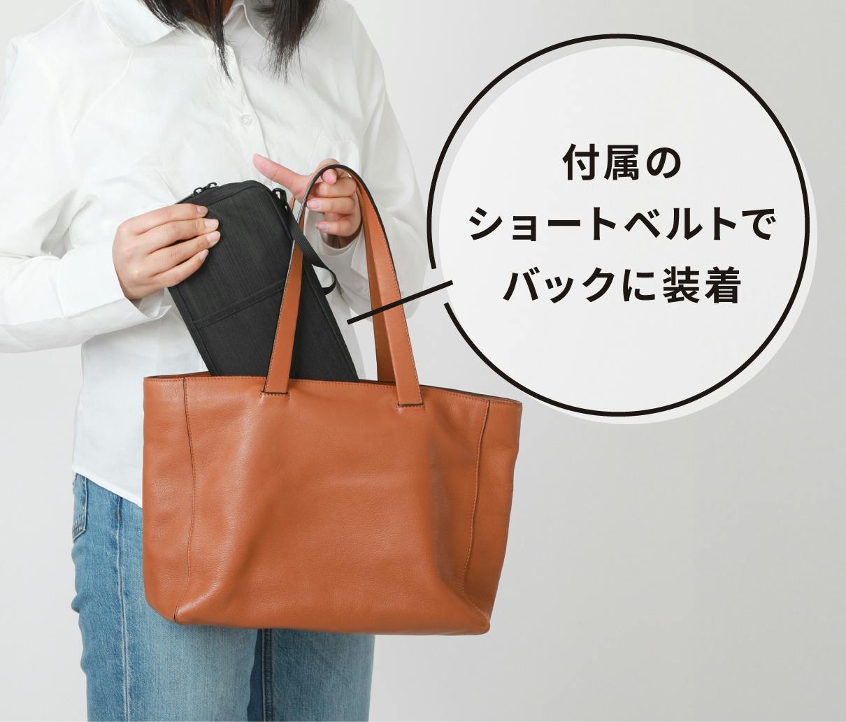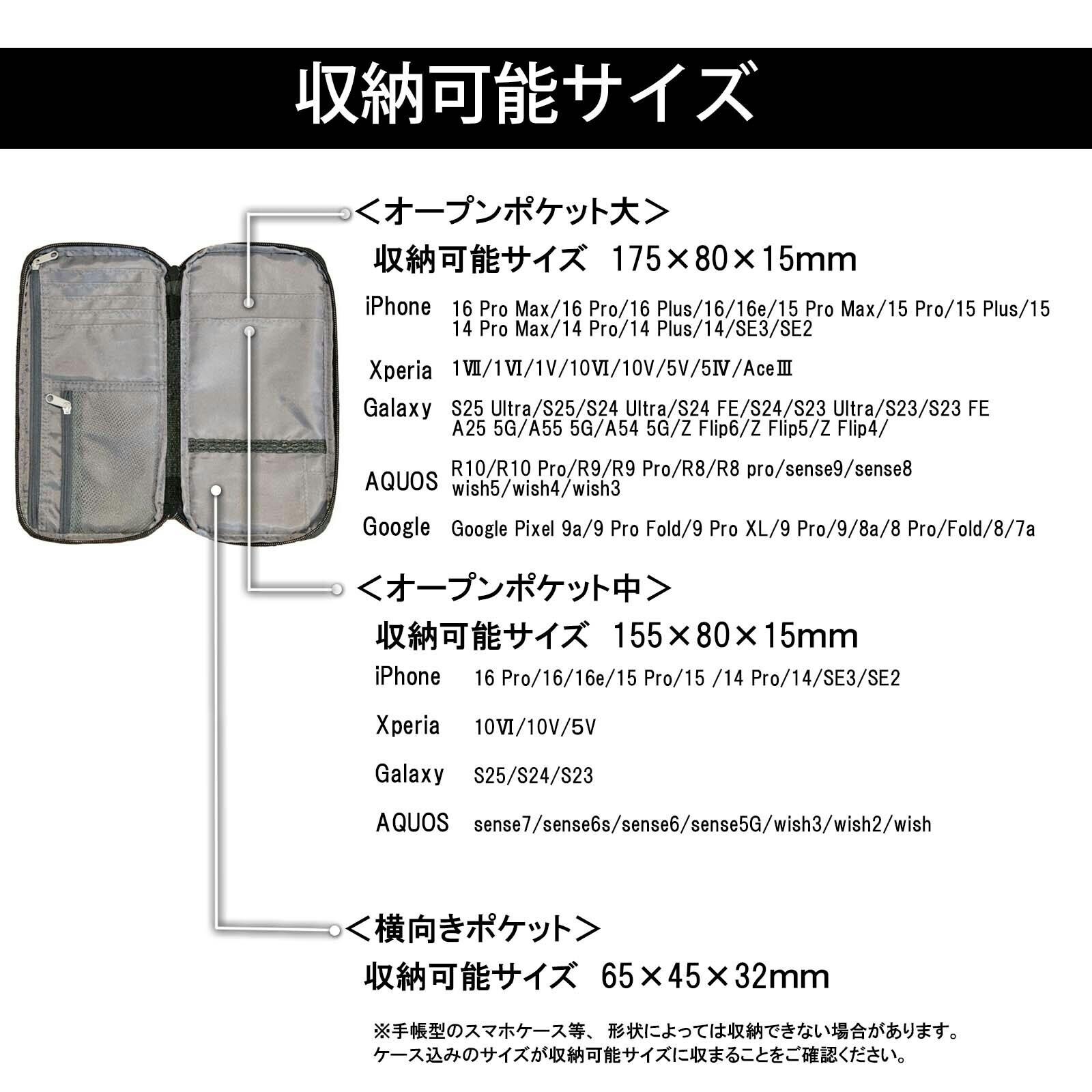 外側に2つのポケット、内側に5枚のカード入れ、2つのファスナー付きポケットと、3つのオーポンポケット、さらにゴムのケーブルホルダーを配置。しっかりとした収納力で”こんなに入る?”を体感していただけます。
