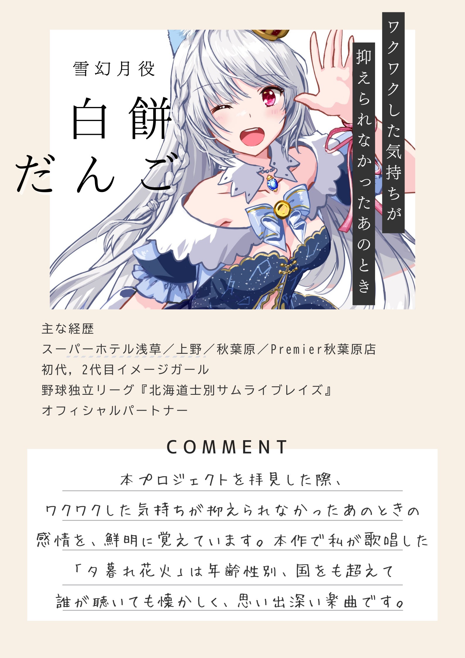 『白餅だんご』ライトプラン~コンプリートプランのいずれかをご支援してくださった方には “平山笑美と白餅だんごデュエットver.「Awaken」”1曲 をデジタルデータでお送りいたします。