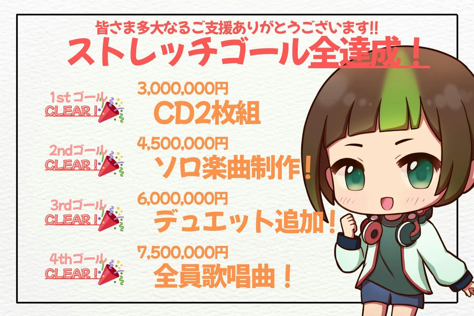また、目標金額以上の金額が集まった際のストレッチゴールを設定させていただいております!!内容の充実、各キャストの歌唱楽曲数アップ、収録楽曲数のアップなどを目標としております。詳しくは下記「ストレッチゴール」をご確認くださいますようよろしくお願いいたします!