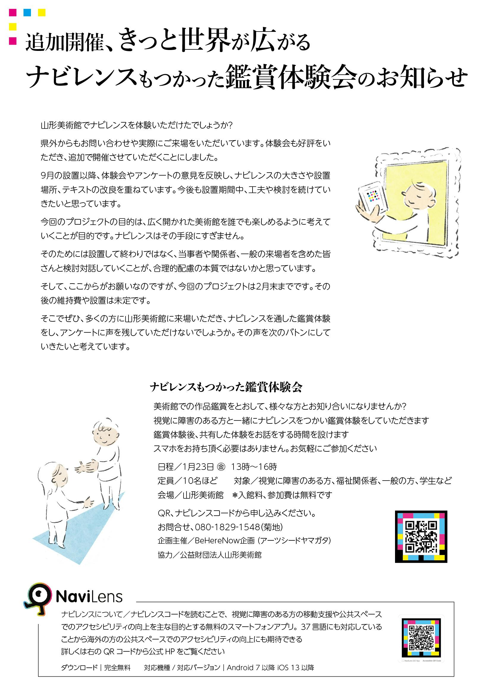 2025/12/07 18:09追加開催、きっと世界が広がる ナビレンスもつかった鑑賞体験会のお知らせ山形美術館でナビレンスを体験いただけたでしょうか?県外からもお問い合わせや実際にご来場をいただいています。体験会も好評をいただき、追加で開催させていただくことにしました。9月の設置以降、体験会やアンケートの意見を反映し、ナビレンスの大きさや設置場所、テキストの改良を重ねています。今後も設置期間中、工夫や検討を続けていきたいと思っています。今回のプロジェクトは、広く開かれた美術館を誰でも楽しめるように考えていくことが目的です。ナビレンスはその手段にすぎません。そのためには設置して終わりではなく、当事者や関係者、一般の来場者を含めた皆さんと対話し検討していくことが、合理的配慮の本質ではないかと思っています。そして、ここからがお願いなのですが、今回のプロジェクトは2月15日までです。その後の維持費や設置は未定です。そこでぜひ、多くの方に山形美術館に来場いただき、ナビレンスを通した鑑賞体験をし、アンケートに声を残していただけないでしょうか。その声を次のバトンにしていきたいと考えています。ナビレンスもつかった鑑賞体験会美術館での作品鑑賞をとおして、様々な方とお知り合いになりませんか?視覚に障害のある方と一緒にナビレンスをつかい鑑賞体験をしていただきます鑑賞体験後、共有した体験のお話をする時間を設けますスマホをお持ち頂く必要はありません。お気軽にご参加ください日程/2026年 1月23日(金) 13時~16時定員/10名ほど対象/視覚に障害のある方、福祉関係者、一般の方、学生など会場/山形美術館 *入館料、参加費は無料です申し込みフォームから申し込みください。https://docs.google.com/forms/d/e/1FAIpQLSdmde1b83kvbmPAPz_060rLJ1btdUHfSr1eE2LeXCTMmwA37A/viewformお問合せ/080-1829-1548(菊地) 企画主催/BeHereNow企画(アーツシードヤマガタ)協力/公益財団法人山形美術館 もっと見る12月7日、木村清さんが講演されます