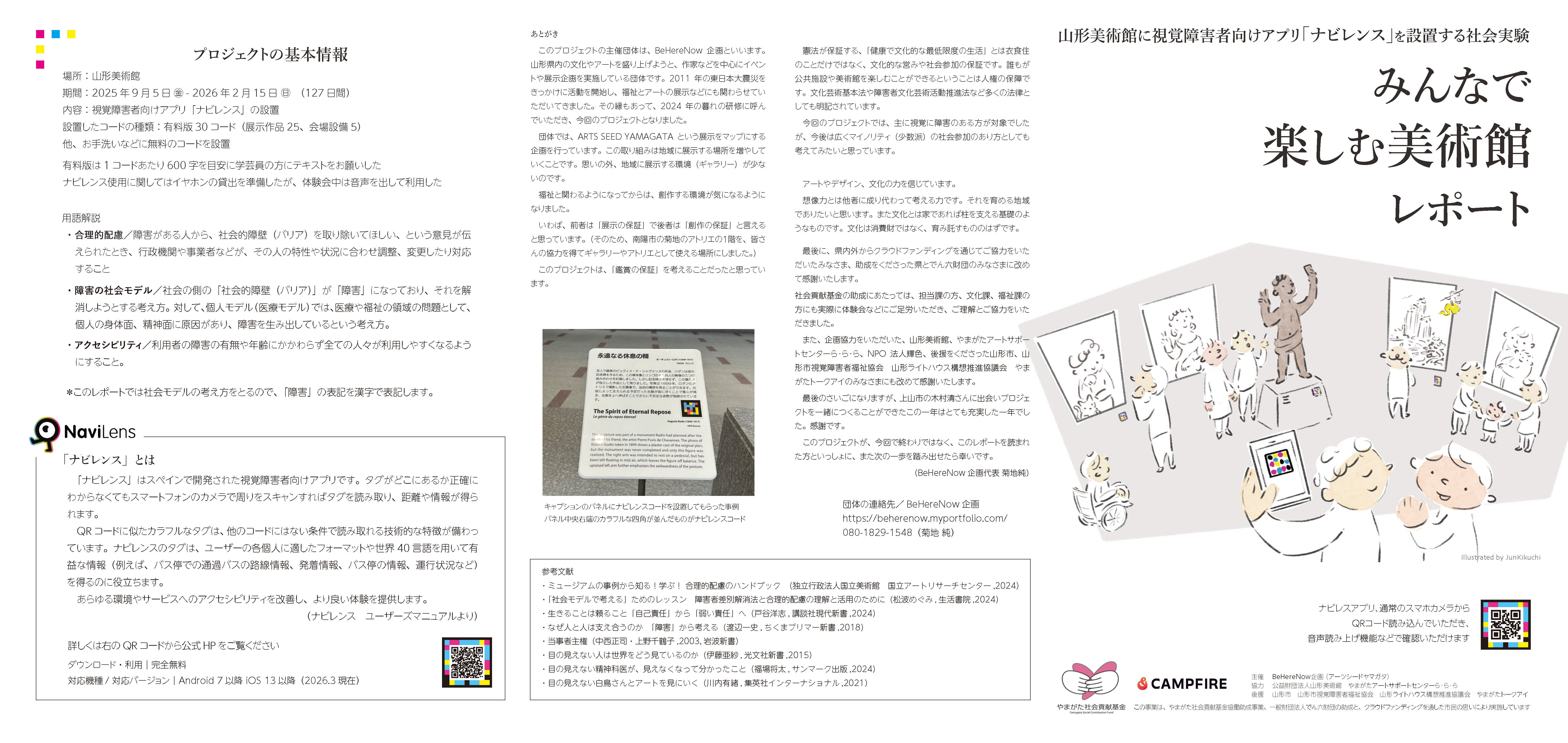 その後、ご支援いただいた「山形美術館に視覚障害者向けアプリ「ナビレンス」を設置する社会実験」は、2月15日までの設置期間を無事終えることができました。多くの方に体験いただき、簡単ですがデザイナーの視点からレポートにまとめました。