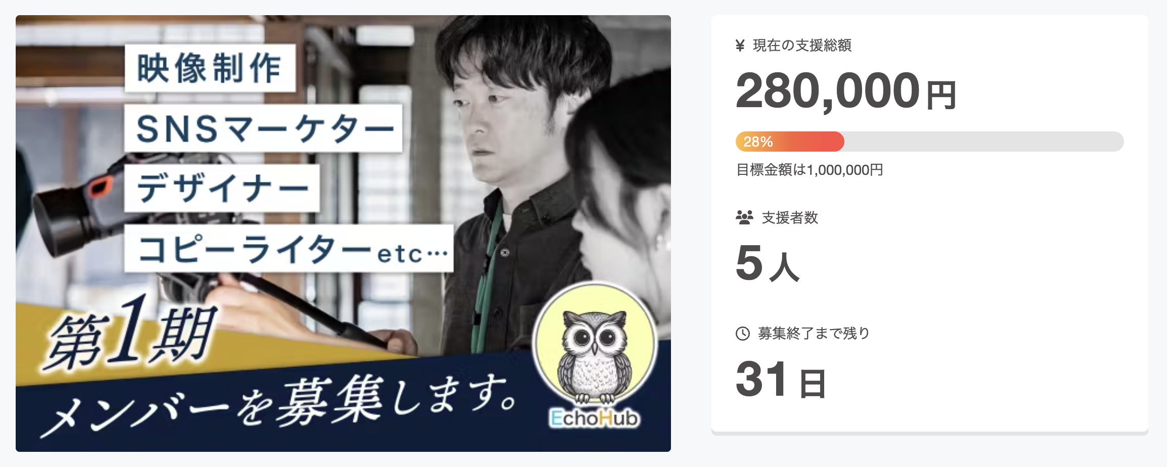 EchoHubのクラウドファンディングが始まって、昨日で2日目となりました。早くも28万円のご支援をいただき、まもなく30万円に到達しそうです!この勢いあるスタート、本当にうれしく、そして感謝の気持ちでいっぱいです。開始前には、多くの方に連絡させていただきました。「応援してるよ!」「こういうの名古屋に必要だと思ってた」そんな温かい声をたくさんいただき、何よりも、私たちの取り組みや想いに共感してくれる人がこんなにいるんだと実感できたことが嬉しかったです。「東京や大阪にはこういう場があるけど、名古屋にはまだないよね」「ただ仕事を得るための場ではなく、お互いに学び、成長しあえるコミュニティって素敵だね」そんな言葉が、何よりの励みになりました。クラウドファンディングは5月31日まで続きます。今後も活動報告を通して、進捗や裏側、そしてみなさんへの感謝をお伝えしていきます。7月にはプレオープンイベントも予定しており、スペシャルゲストの参加も決まりつつあります。こちらもお楽しみに!改めて、最高のスタートを切れたことに心より感謝します。引き続き、どうぞよろしくお願いいたします!
