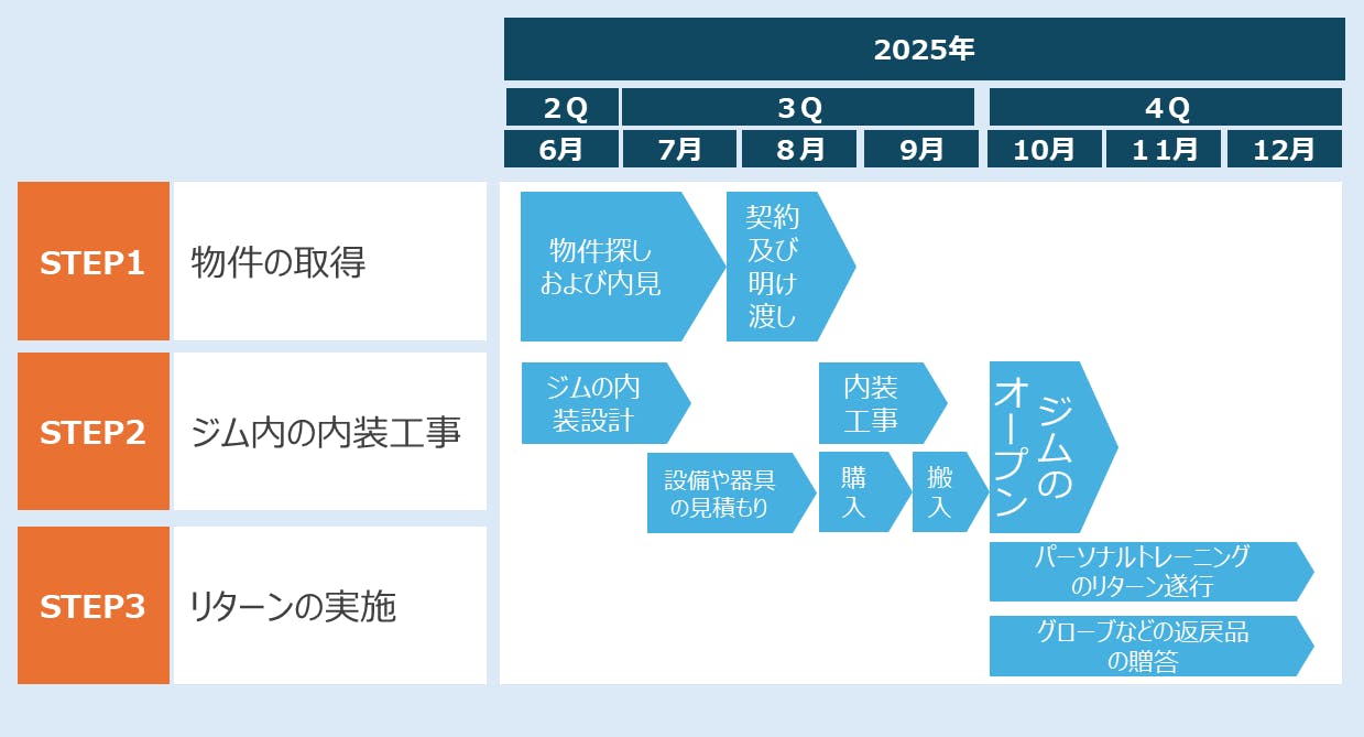 10月 ジムをオープンし、皆様にリターンを実施していきます!