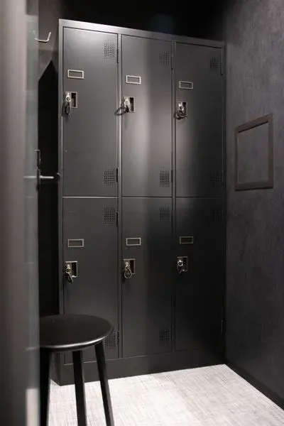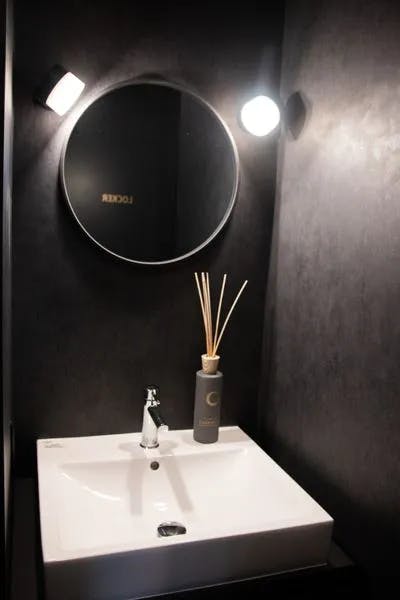 → 天井が高く、黒を基調としており高級感をもちつつ開放感のある空間。ダンベルラックやトレーニングマシンを配置。2:メイク&更衣スペース