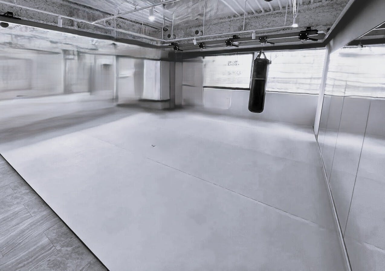 → 壁際にサンドバッグが吊るされ、マット敷きの格闘スペース。4:フリーウエイトエリア