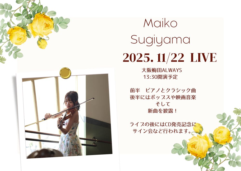 2025/12/03 08:0011月22日のライブにお越しくださいまして、誠にありがとうございました。クラウドファンディングでご支援くださった皆さま、チケットをご購入くださった皆さま、そしてCDのご感想をお寄せくださった皆さまに、心より御礼申し上げます。いただいたお気持ちはどれも大変ありがたく、言葉に尽くせません。また、共演してくださった演奏者の皆さまのおかげで、素晴らしい音楽をともに奏でることができました。深い尊敬と感謝をここに記させていただきます。さて、12月に入り、以前よりお知らせしておりました入院・手術に向けた準備および休養期間に入ります。セカンドオピニオンを受けた結果、当初とは別の医療機関にて診療を進めることとなり、現在は遺伝子検査を含む各種検査を行いながら、手術に向けて最終確認中です。手術日は 12月19日 と決まりましたので、ここにご報告いたします。手術までの間は、X(旧Twitter)やInstagramにて、できる範囲でバイオリンや日常など発信していきたいと思っております。温かく見守っていただけましたら幸いです。関わってくださった全ての方々に、ありがとう。杉山麻衣子 もっと見る