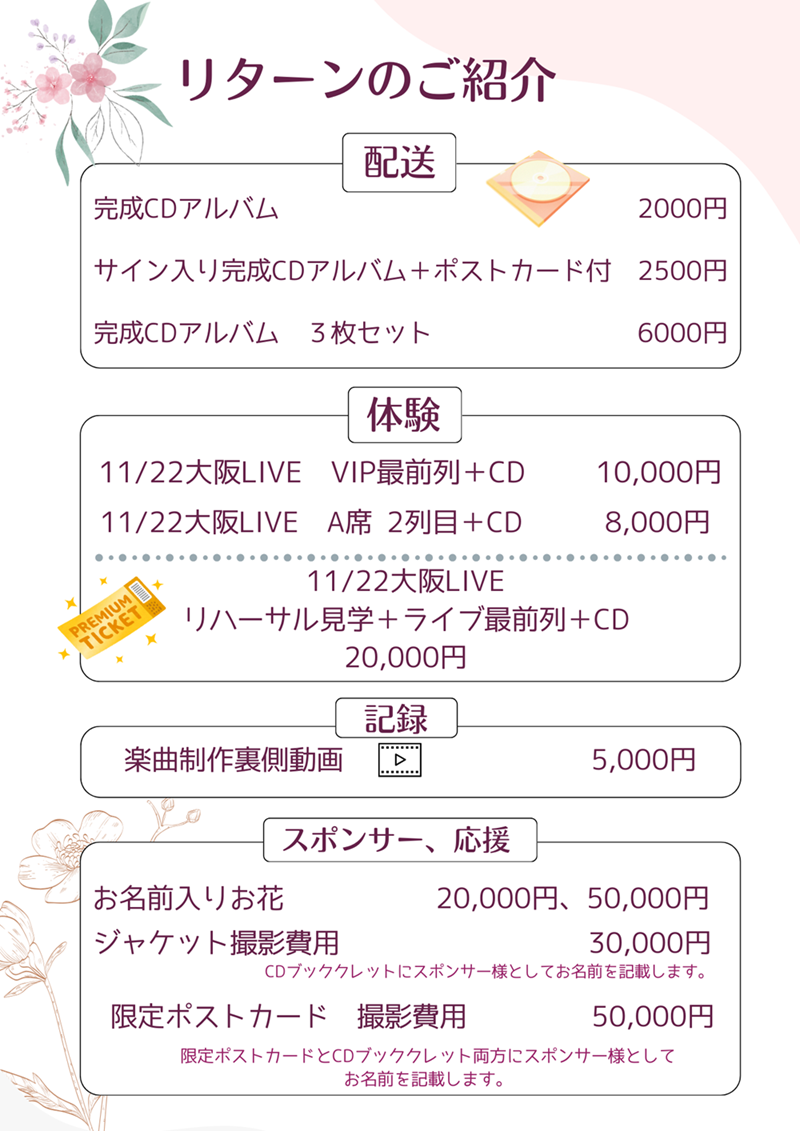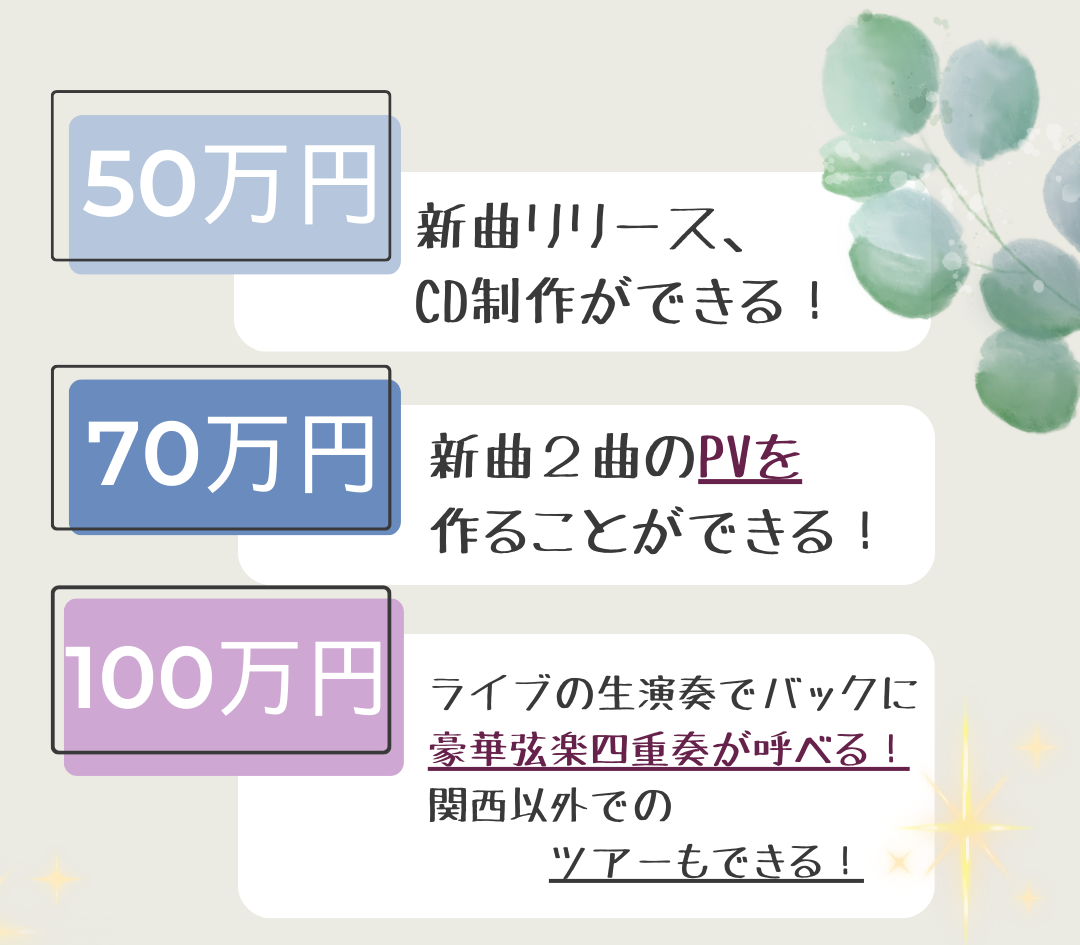 2025年5月7日、皆様のご支援のおかげでファーストゴール達成致しました!本当にありがとうございます!ネクストゴールと致しまして、5月19日までに、CDの音源とワンマンライブの音源が今以上に華やかになるように、そしてピアノ・チェロ・ビオラやアコースティックギターなどの演奏者をお迎えできるよう、引き続き全力で取り組んでまいります。どうぞよろしくお願いいたします!