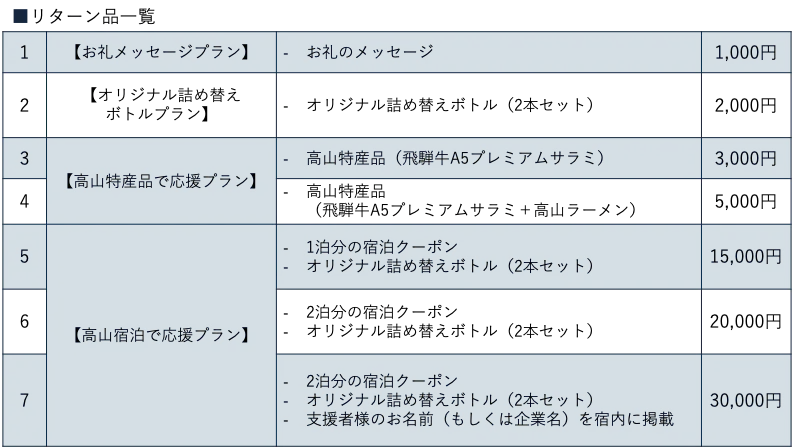 リターンは、【高山宿泊で応援プラン】【高山特産品で応援プラン】が高山を体感できるのでオススメです!
