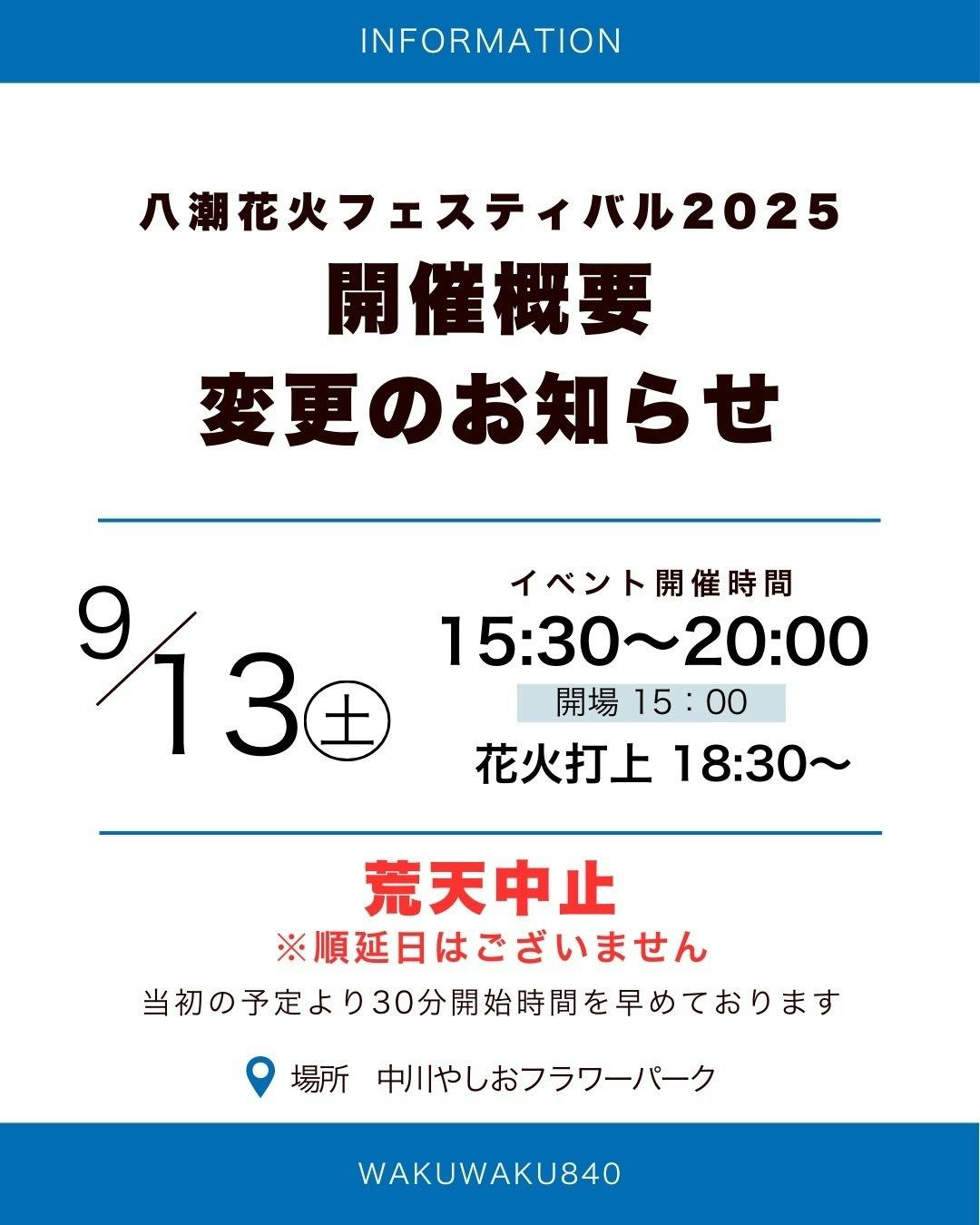 平素より「八潮花火フェスティバル2025」への温かいご支援・応援をいただき、誠にありがとうございます。このたび、開催時間の変更および荒天時の対応についてご案内申し上げます。
