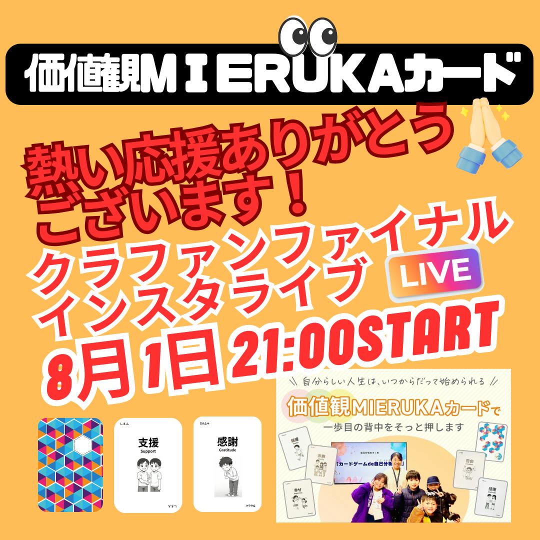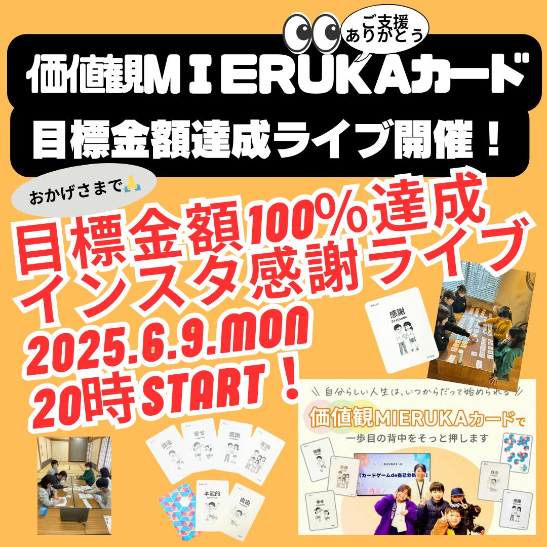 2025/07/30 23:23【セカンドゴール達成!心からの感謝を込めて】みなさまの温かいご支援のおかげで…ついに セカンドゴール「20万円」達成しました!!本当にありがとうございます!このプロジェクトに共感し、応援してくださった皆さまのひとつひとつのご支援が、「価値観MIERUKAカード」というカタチになって、たくさんの“気づき”を届ける力になっています。【プロジェクト終了まで、残り2日!】クラウドファンディングの終了が、いよいよ間近に迫ってきました。「気になっていたけど、まだ支援していない」「迷っていたけど、やっぱり応援したい」という方がいらっしゃいましたら、どうかこのラストチャンスをお見逃しなく!「価値観を見える化することで、自分を好きになれる」「親子で対話が深まるきっかけになった」など、体験者の声も続々届いています。【支援方法・リターンのご案内はこちら】▶ https://camp-fire.jp/projects/839740/view最後まで、一緒に「自分らしく生きる力を育むカード」を広げていただけたら嬉しいです。引き続き、応援よろしくお願いいたします! もっと見る