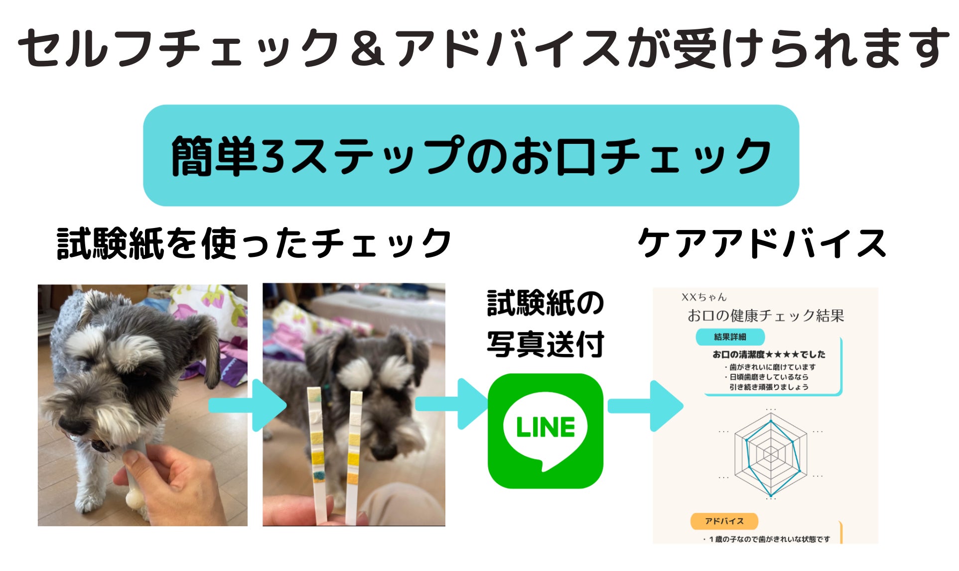 ペットのお口の健康チェックキットでお口の中の健康チェックを月1回確認しながら、デンタルケアセミナーを受講いただき、正しい知識を学びながら歯ブラシでの歯磨きを目指していただきたいと思います。