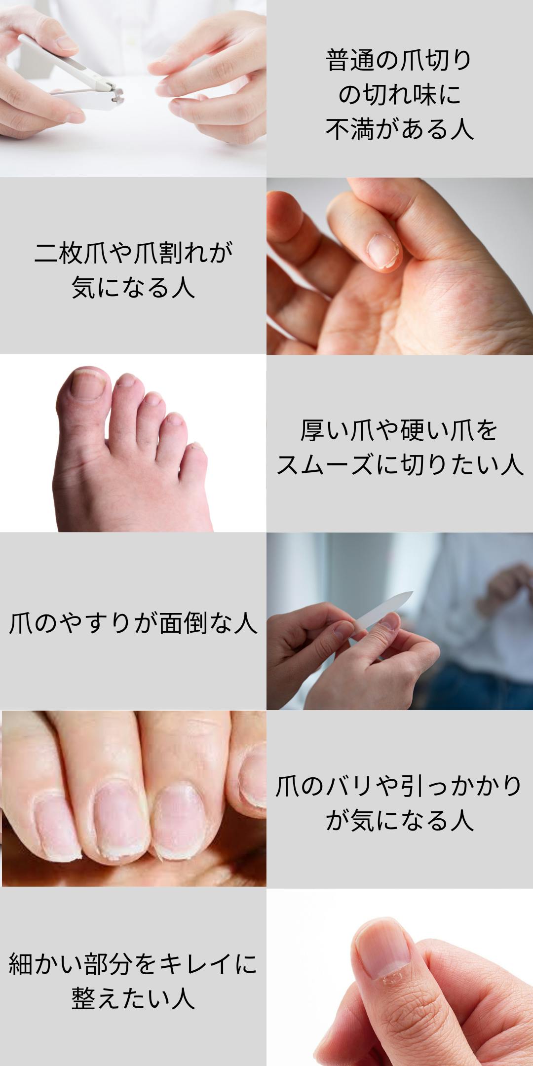 A. 手の爪・足の爪・巻き爪など、さまざまな形の爪に対応しており、男女問わず幅広い方におすすめです。ご家族での共有やギフトにも最適です。