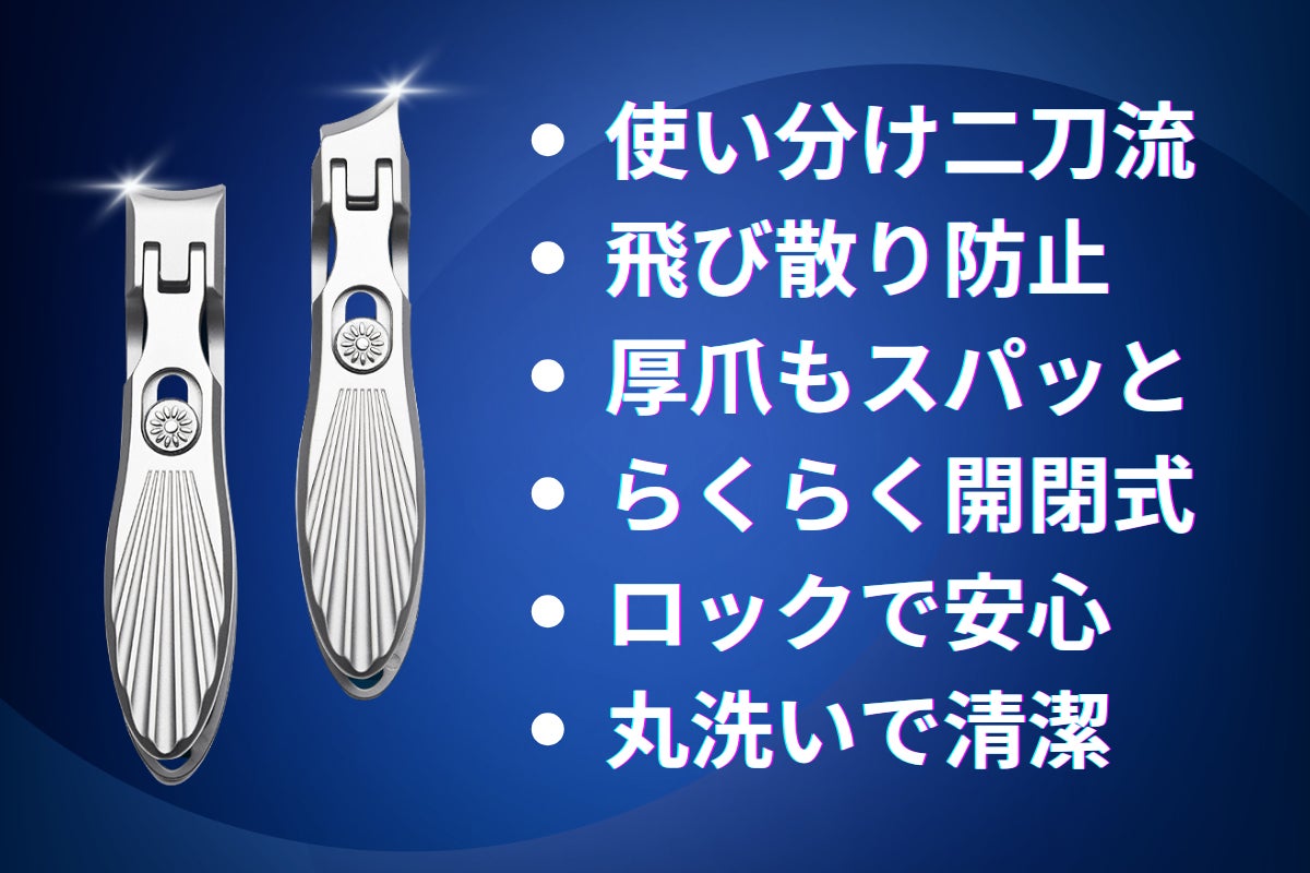 そこで誕生したのが、爪切り二本組『Twin Edge』です。曲線刃と斜め刃の“二刀流”で、手・足・巻き爪・ささくれなど幅広く対応。さらに飛び散りにくい刃構造、水洗い可能な高耐久素材、ロック付き折りたたみ設計など、快適さにもこだわり抜きました。