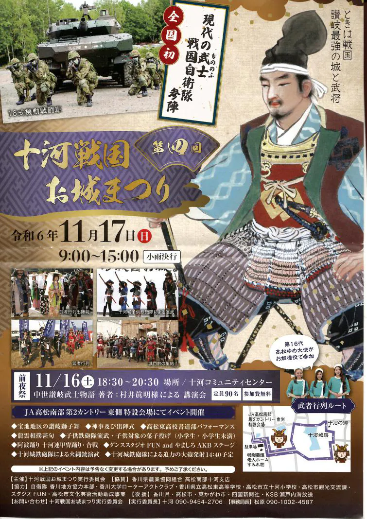 このお祭りは、戦国武将の十河氏の子孫が中心となって運営しており、地元の十河甲冑隊や全国から集まった武士たちが練り歩きます。また、鉄砲隊による演武、ご当地アイドルによるコンサート、阿波踊り、書道パフォーマンス、自衛隊の展示や讃岐うどんなどの地元郷土料理でおもてなしをします。そして、地域の文化や歴史にふれ、地元の人々や訪れる観光客にとっても貴重なイベントとなっています。