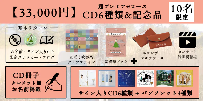 ・今までにリリースしたCD6種類(13,000円相当)SUMiKAサイン入り(現在売り切れている「音ノ雨」は、新パッケージの再印刷バージョンを最速でお届け。「音ノ雨」のみお届け時期は2026年1月を予定。)