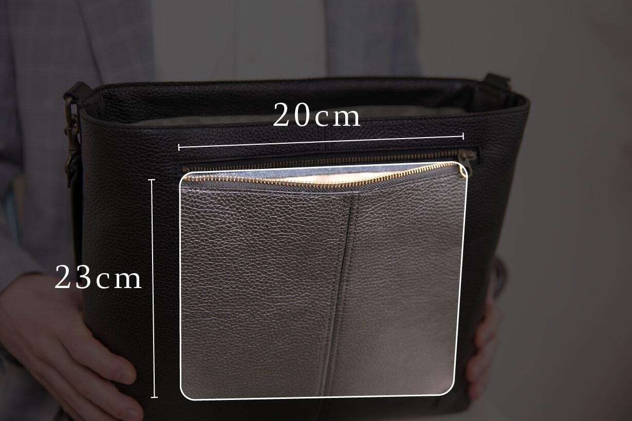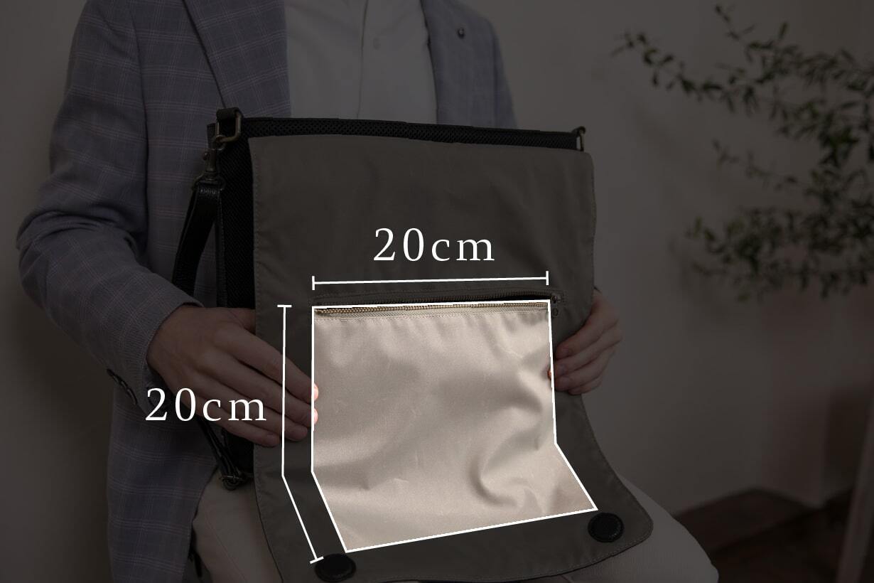 サイズも高さ20cm × 幅20cmと、長財布やA5ノート、文庫本、小型のタブレットなどがしっかり収まる実用的なスペース。