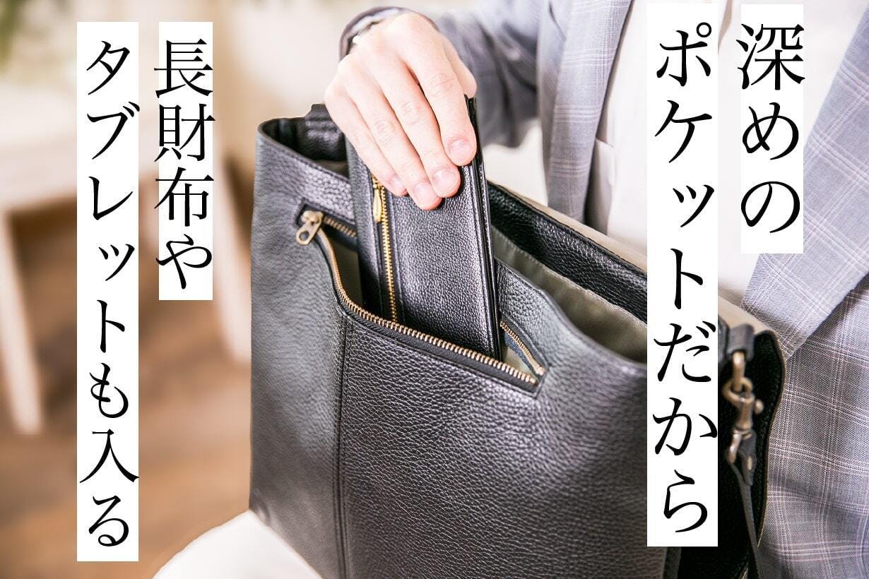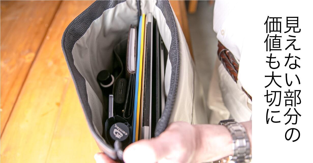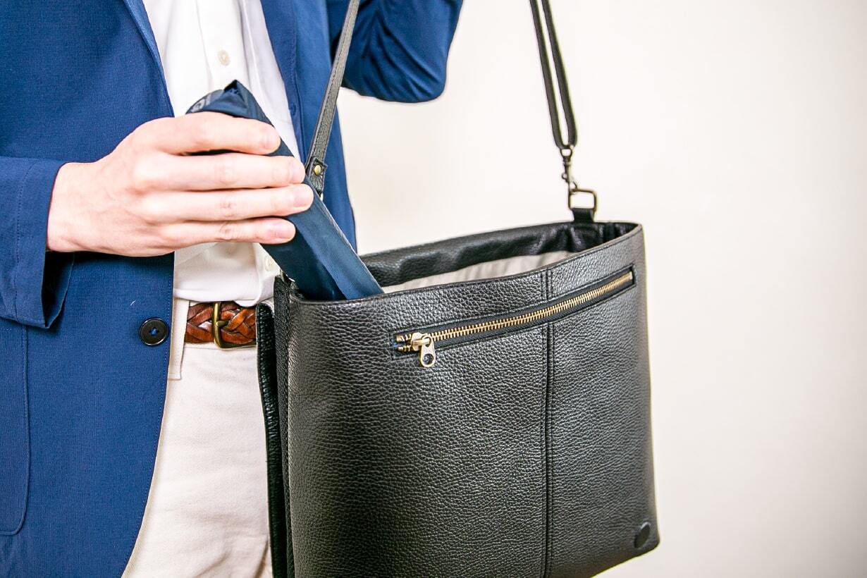 当然、オシャレなだけではなく、必要なビジネス道具がしっかり収納できて、本革なのに雨に強いという機能面も充実しています。