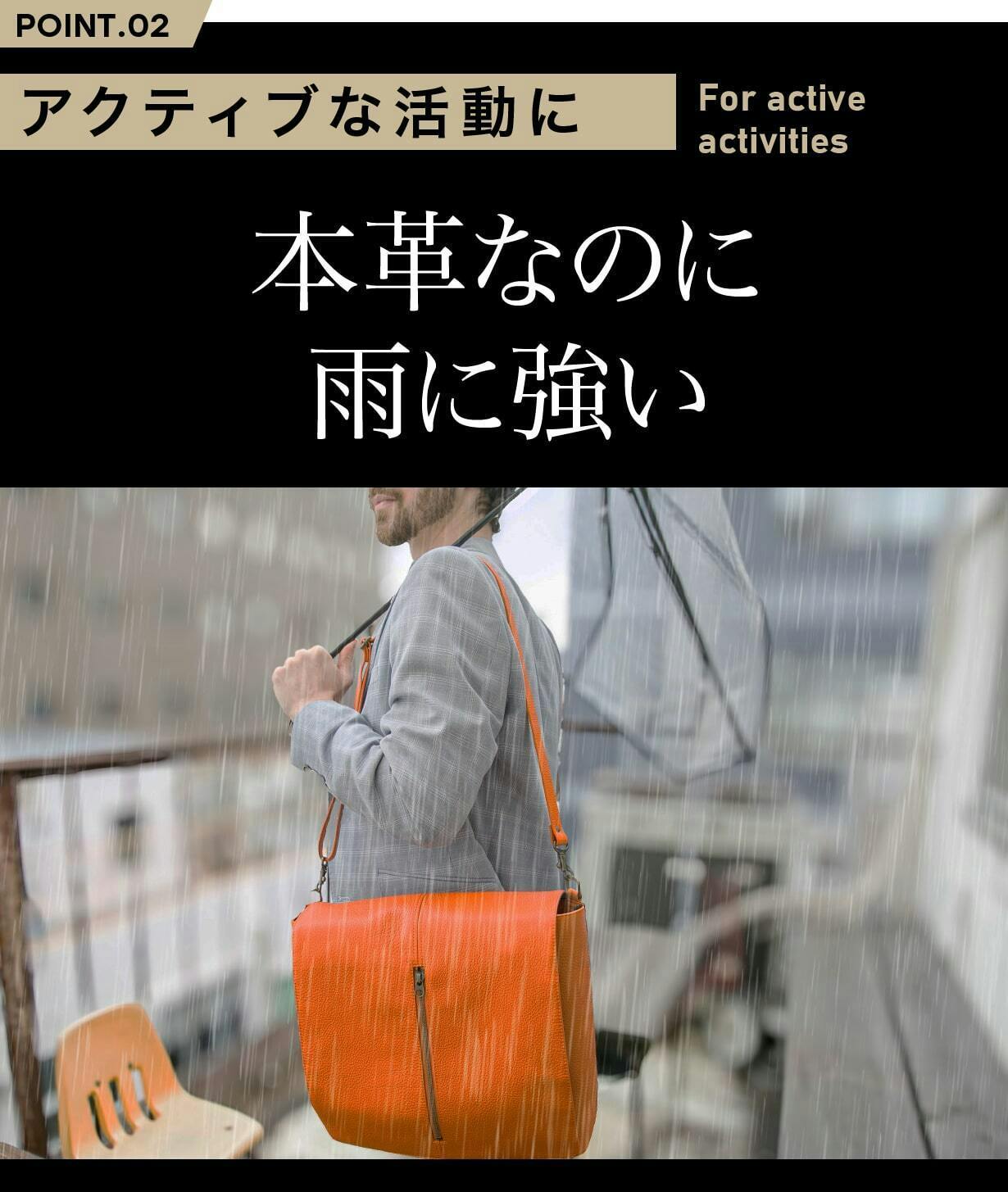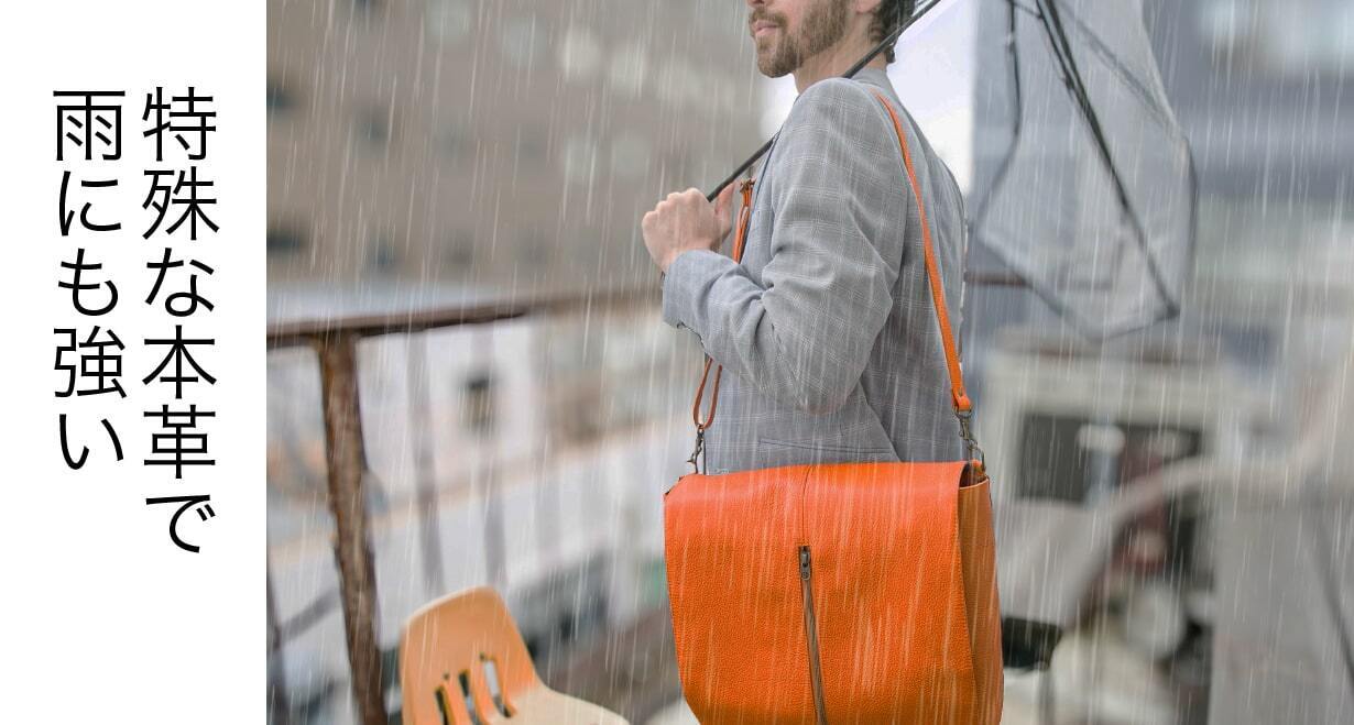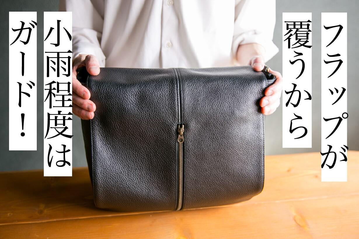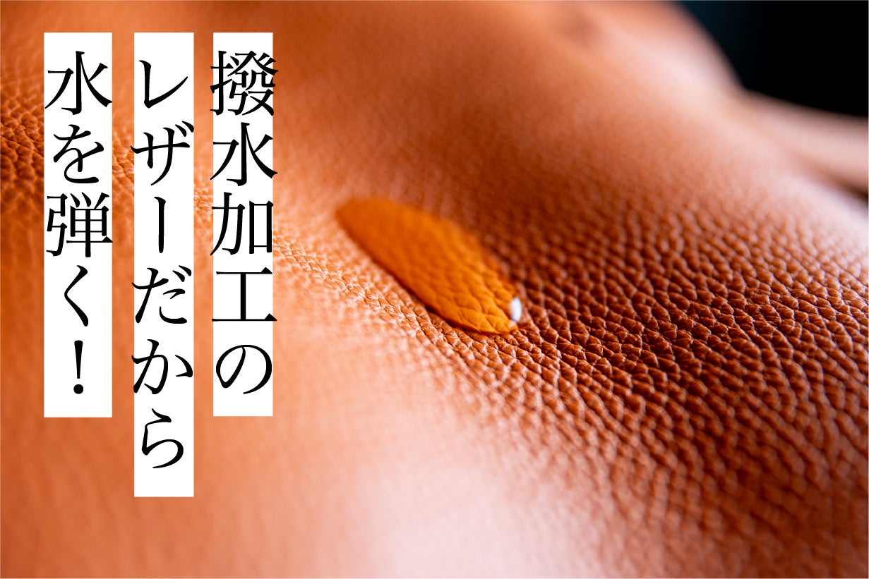 独自の加工技術により、レザー表面に水を弾く特性を持たせています。これにより、突然の小雨やうっかり水がバッグにかかった場合でも、バッグの内部をしっかりと保護します。