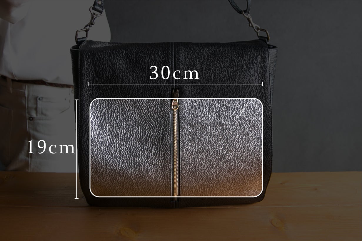 フラップを開けるとすぐにアクセスできる横ファスナー付きポケットは、幅20cm×深さ23cmとたっぷり収納できる実用的なスペース。