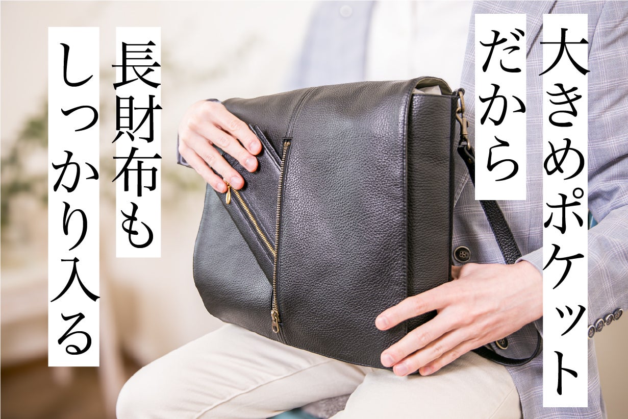 斜めがけスタイルで体の前に回せば、ポケットは手元にスッと移動。電車の中でも立ったまま、座ったままでも片手でアクセス可能です。