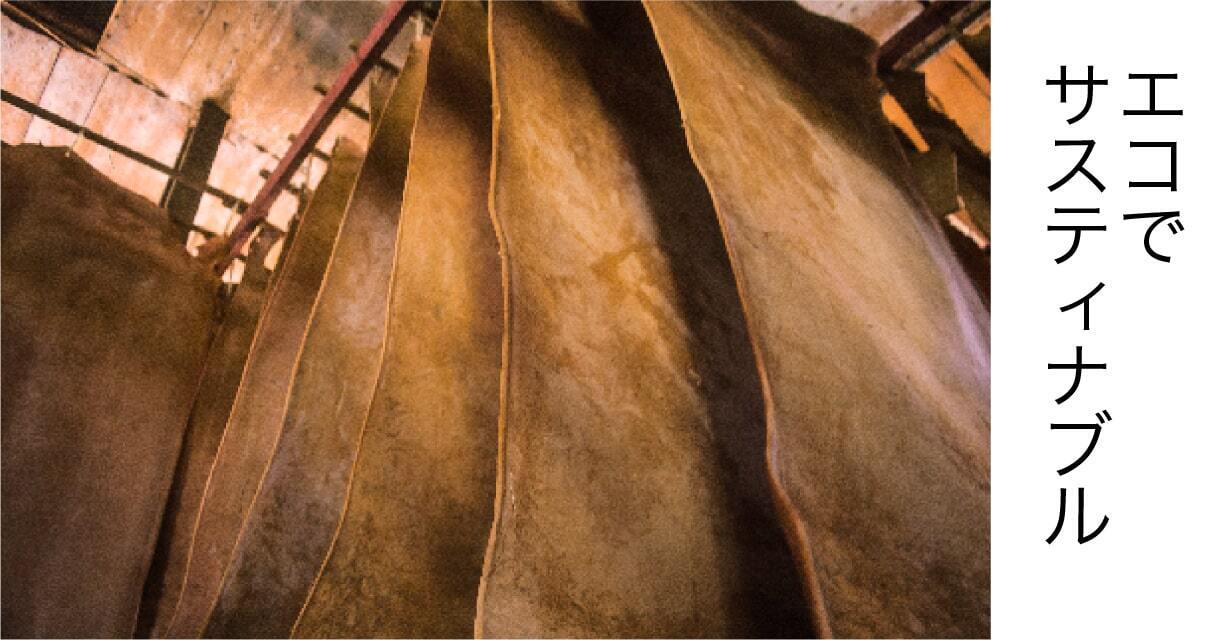 日本の熟練した職人たちが、環境認証ISO14001を取得したイタリアの革工場から取り寄せた、環境に優しいイタリアンレザーを用いて生み出す革製品。それは、日本の伝統技術と地球に優しい素材が融合した、他にはない一品です。