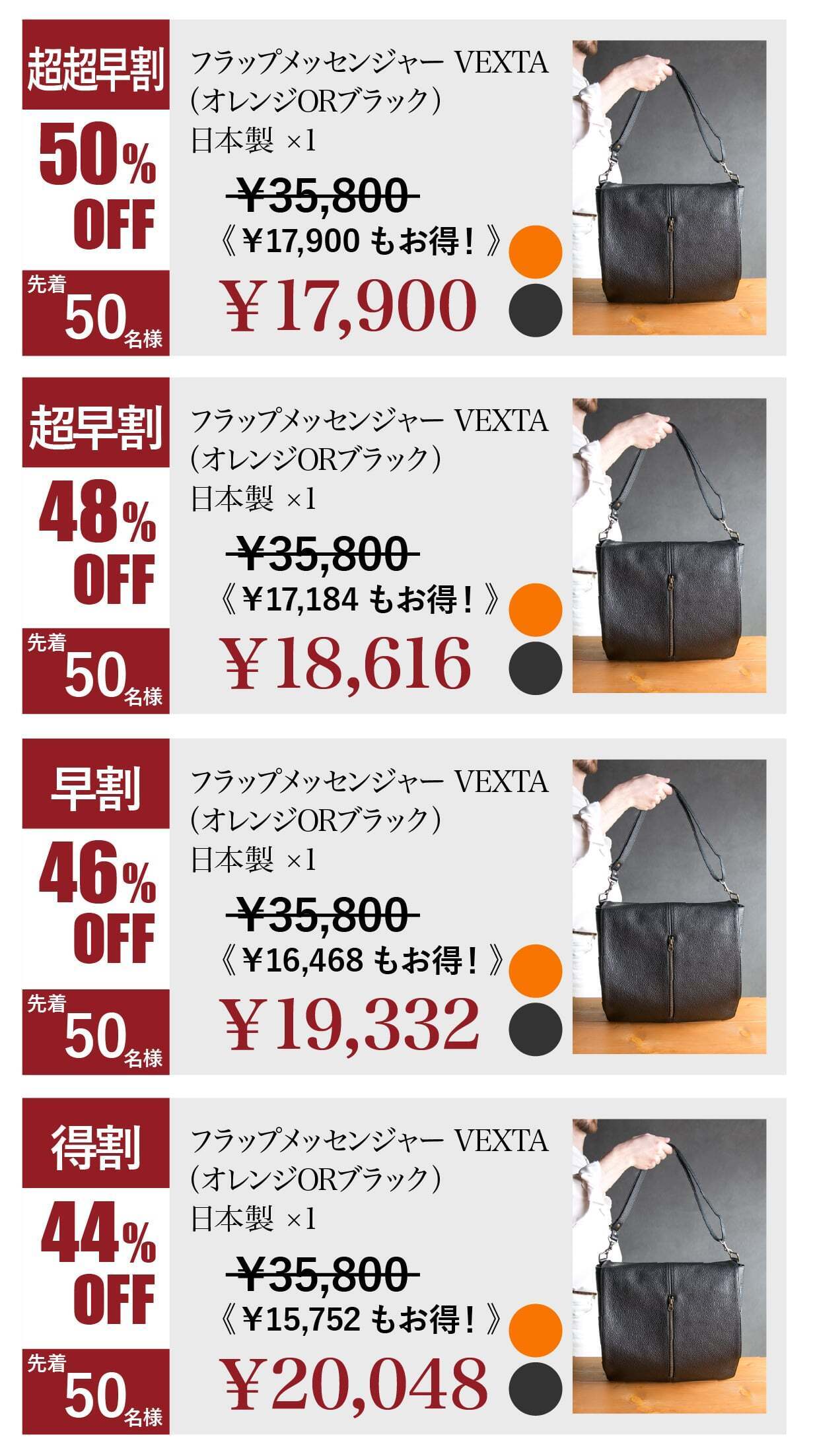 今回は、イタリアンレザーを使用した「オレンジ」と「ブラック」の2カラーをご提案。それぞれが持つ独自の魅力を活かし、あなたのスタイルに最適な選択を可能にしました。