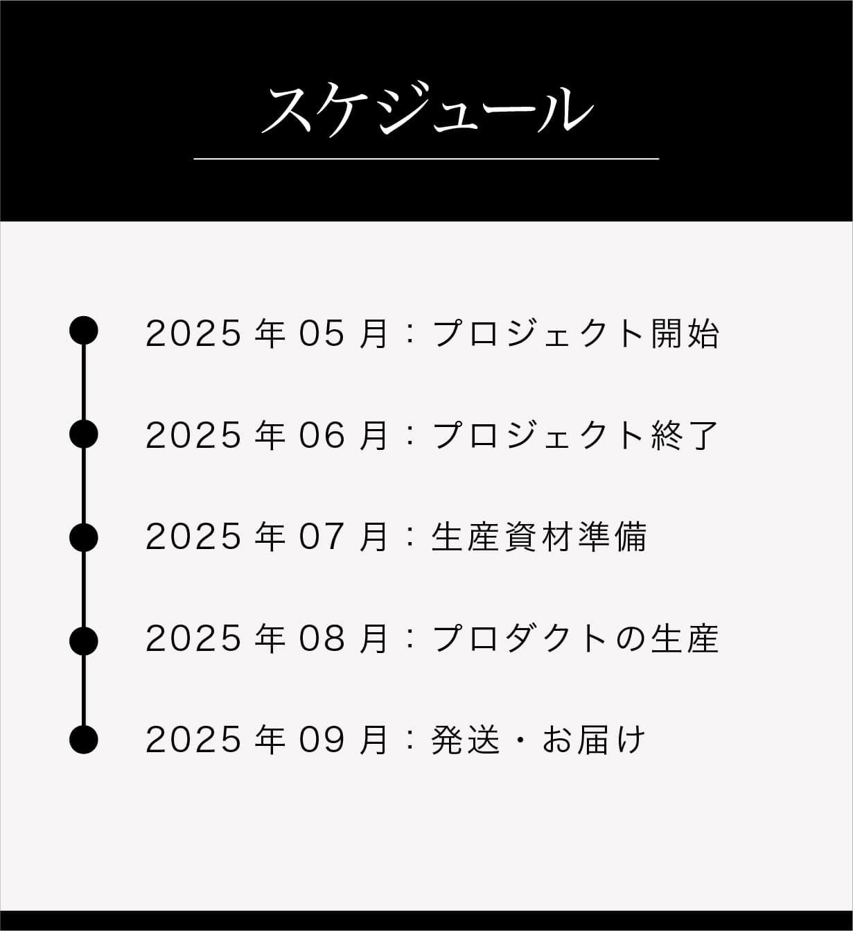 ●引渡し時期: 各リターン詳細に記載の発送予定月を引き渡し時期とします。但し、開発・生産状況によって遅れが生じる場合がありますのでその際は当プロジェクトページ内の「活動報告」または購入者へのメール等で連絡します。