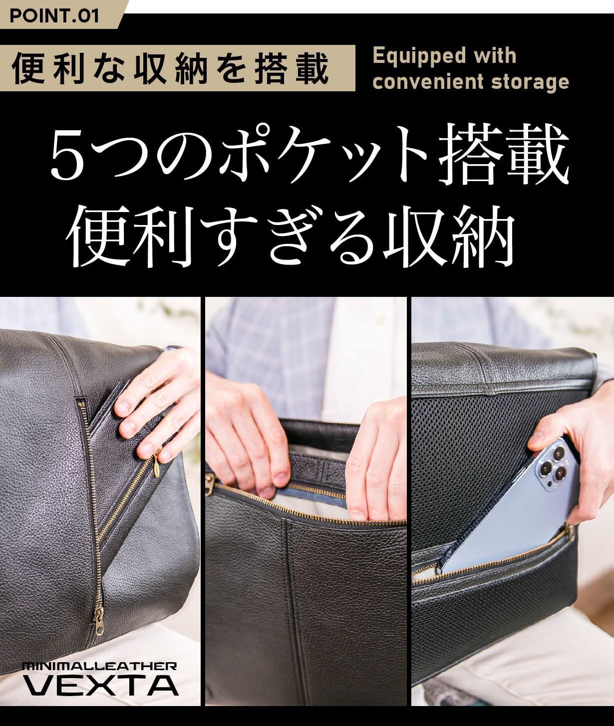 メッセンジャーバッグの魅力は、ただ荷物を入れられるだけじゃ物足りない。VEXTA(ヴェクスタ)は、日々の動線と行動パターンを徹底的に考え抜き、外側3つ、内側2つ、合計5つのポケットを搭載。