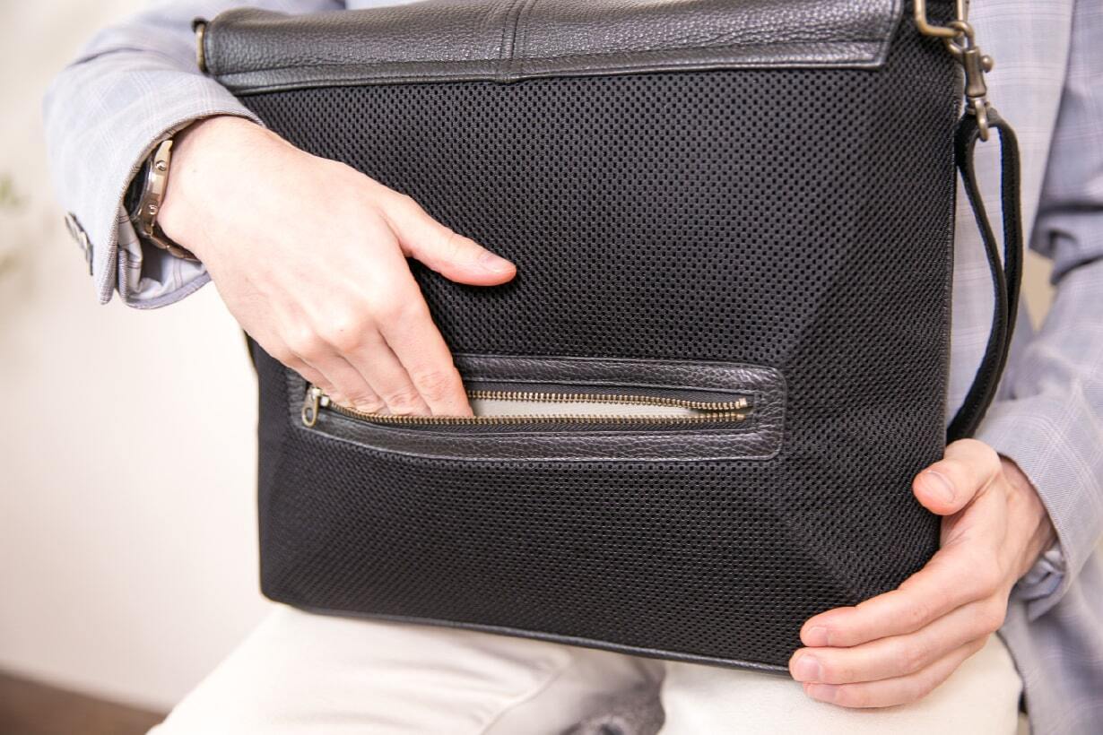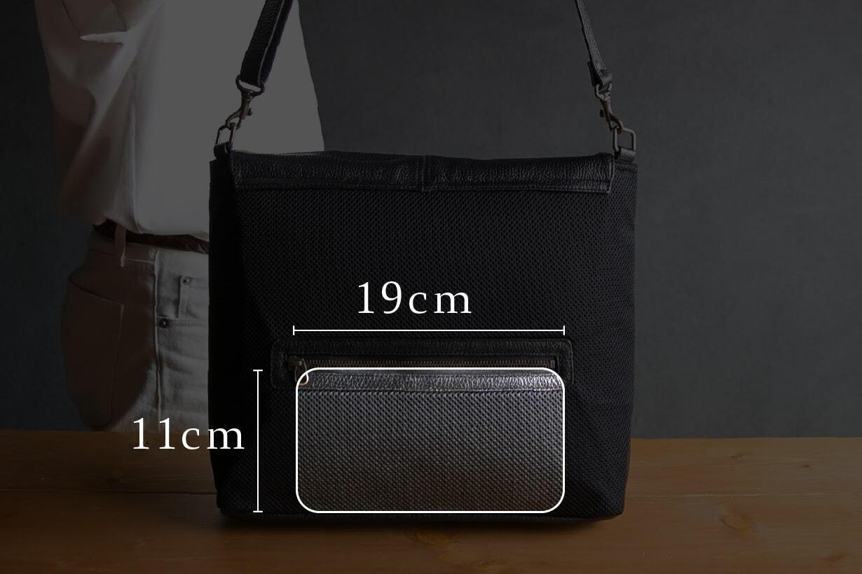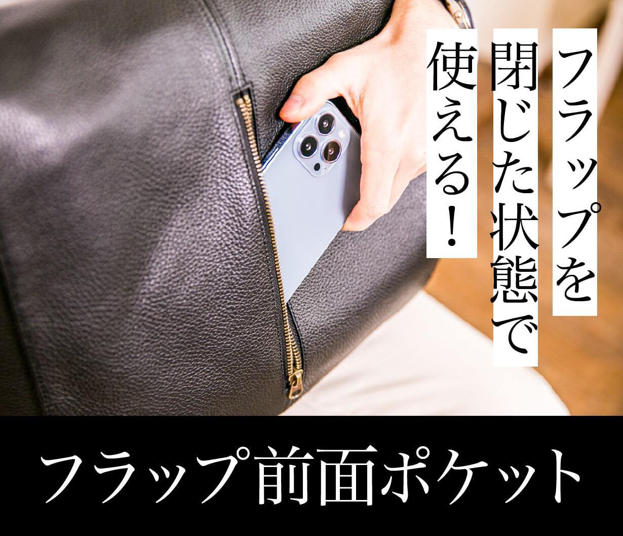 フラップ表面に搭載された縦型ファスナーポケットは、高さ19cm×幅30cmというしっかりとした容量を確保しながら、デザイン全体の印象を引き締める“顔”のような存在です。