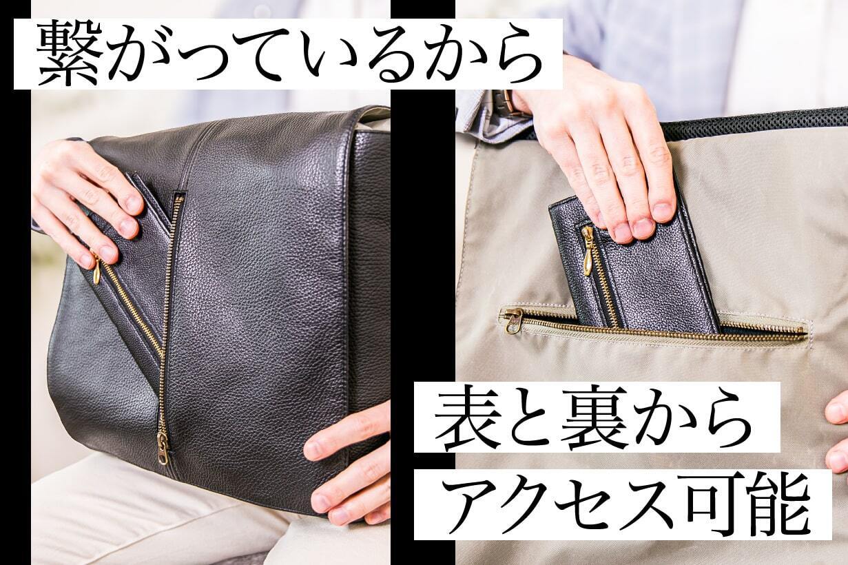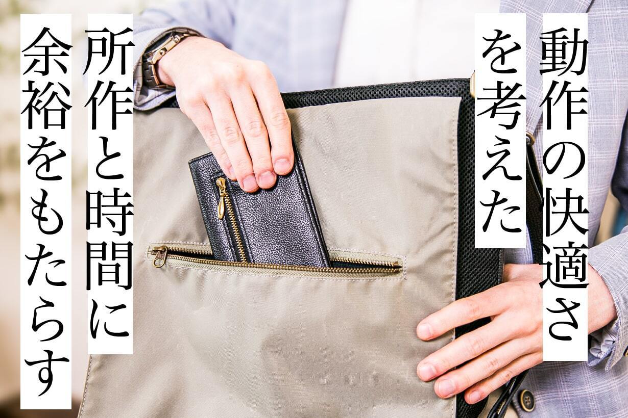 わざわざバッグを開けたり、向きを変えたりすることなく、一連の動作が流れるように完結するのが最大の魅力です。一時的な出し入れ、タブレットのスムーズな収納、スマホやパスケースなどの使用頻度が高いアイテムにも最適。