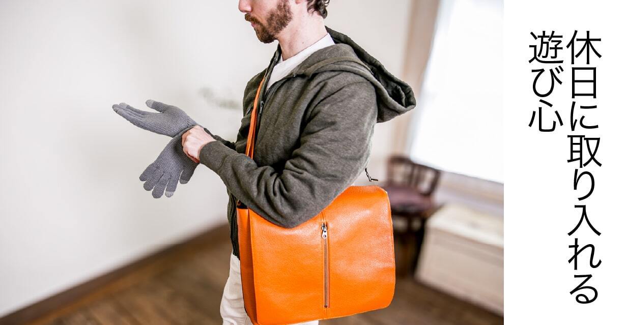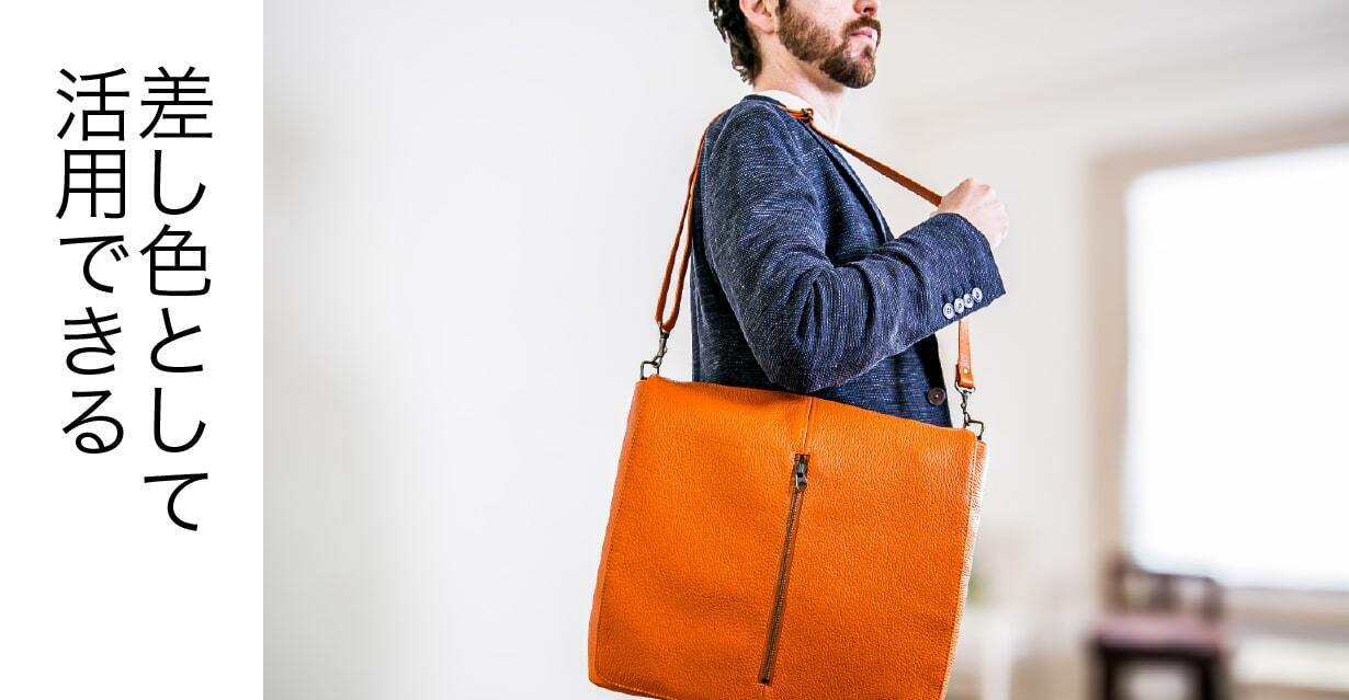 休日のカジュアルコーデに、オレンジのトートバッグをプラスすれば、一気に都会的で洗練された印象に。革特有の深みが、若々しさだけでなく落ち着きも感じさせます。