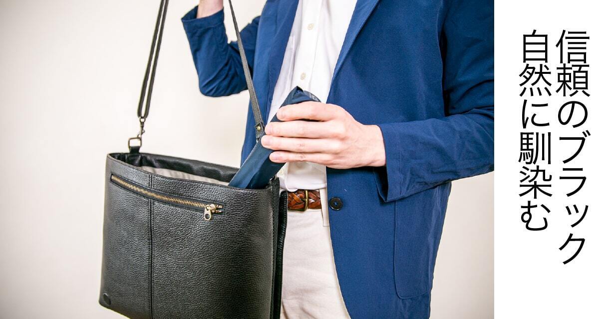ブラックのトートバッグは、スーツスタイルやビジネスカジュアルにぴったり。信頼感を求められる場面でも、自然に馴染むカラーは社会人のマストアイテムです。