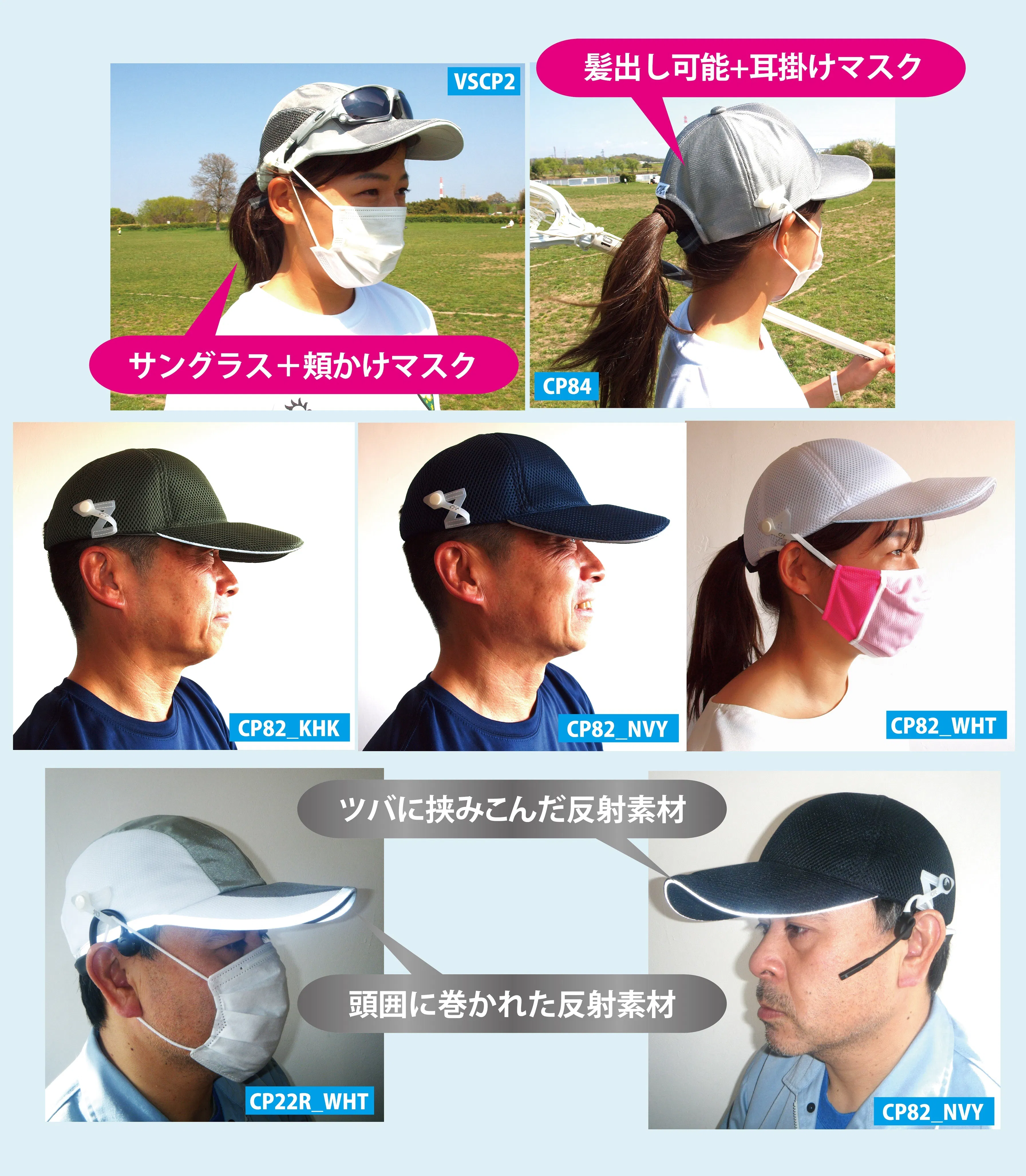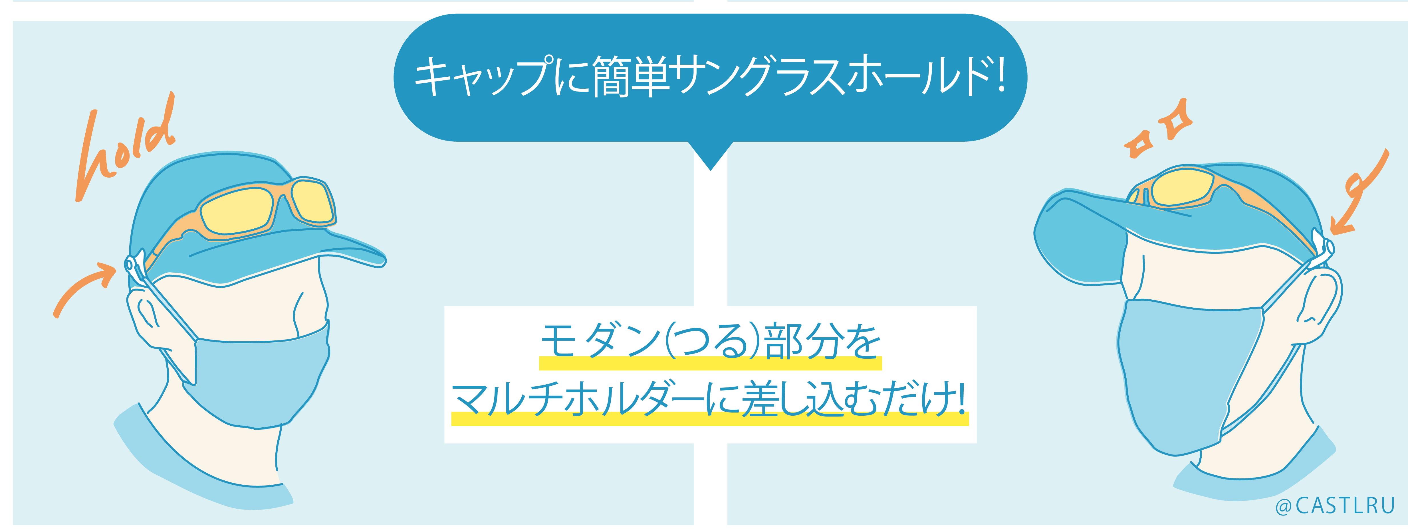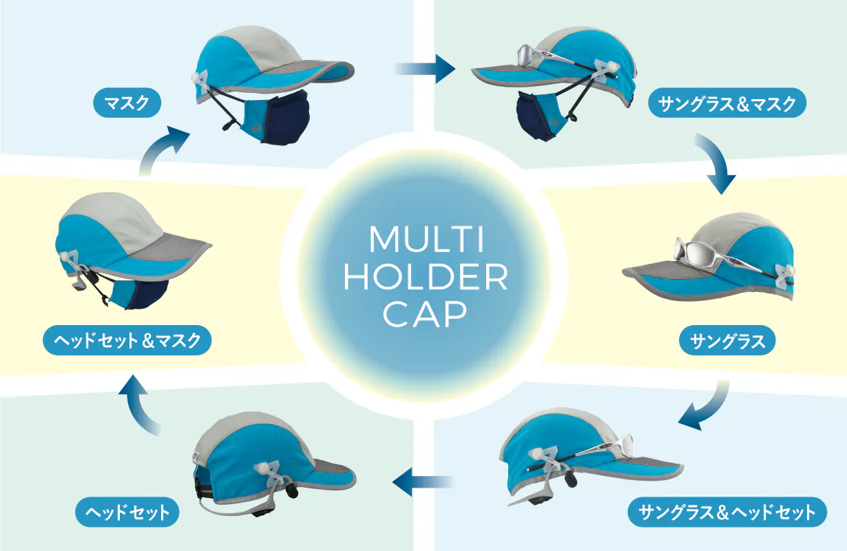 マスク・サングラス・ヘッドセットが同時装着可能なマルチホルダーキャップ