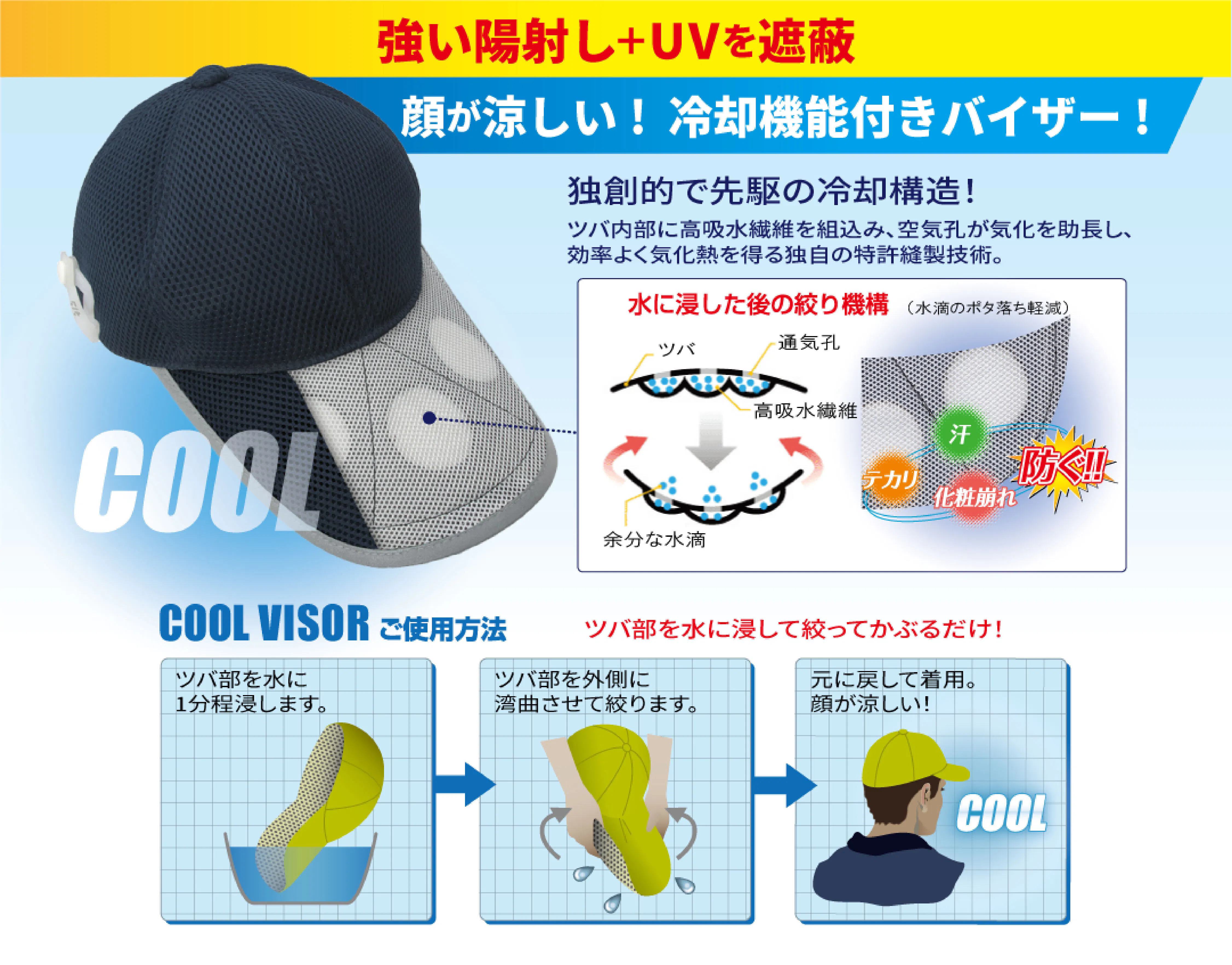 「汗・テカリ・化粧崩れ を防ぐ」!クーリングキャップに早変わり!
