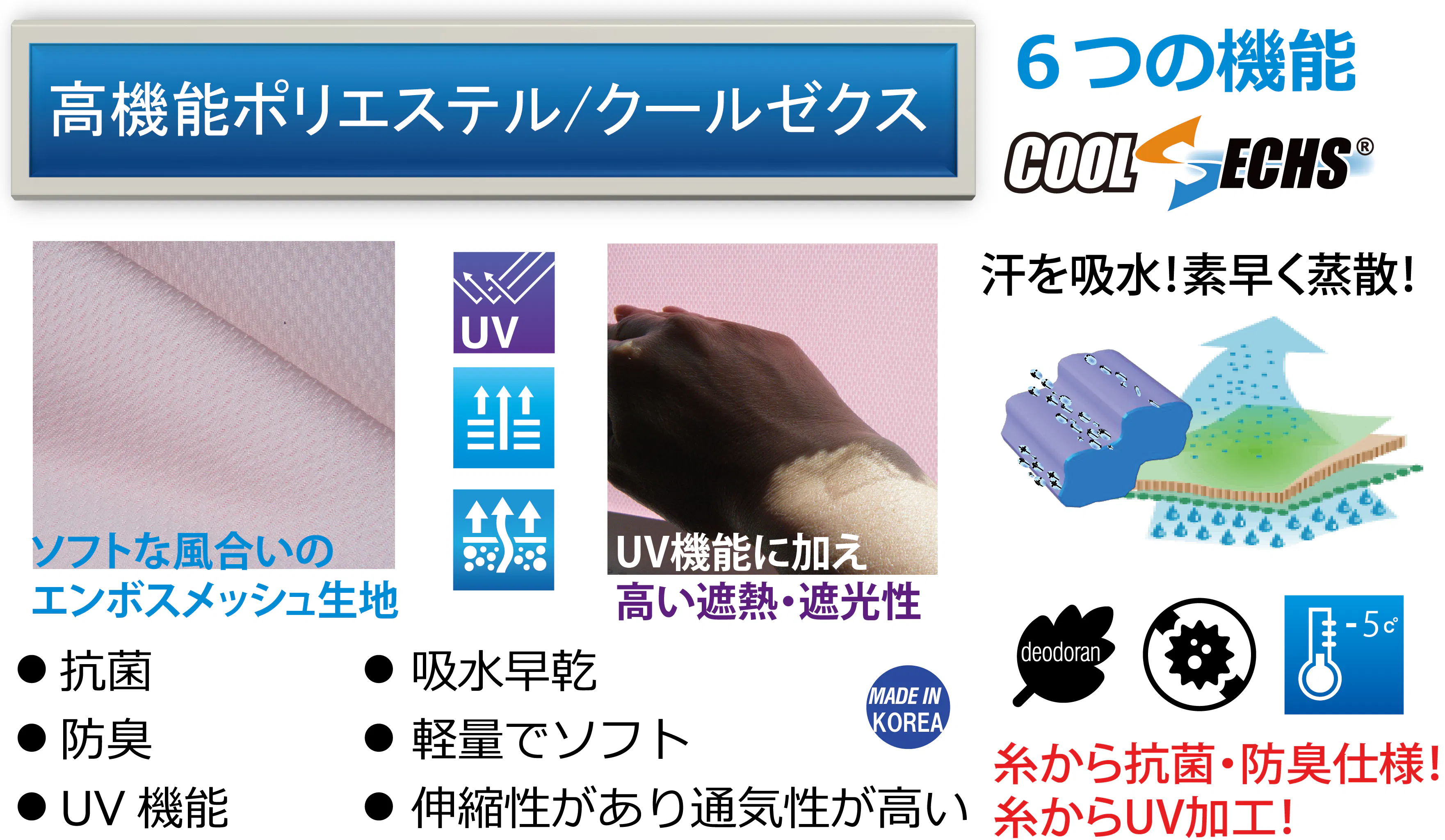 本体カラー展開色の生地は糸から抗菌・防臭+UV仕様です。この生地は凹凸メッシュ状に編まれた 自社オリジナル繊維のクールゼクス®です。吸汗速乾性が高く、薄手軽量で2WAYのスポーツ向けに 開発された高機能ポリエステルです(韓国製)。