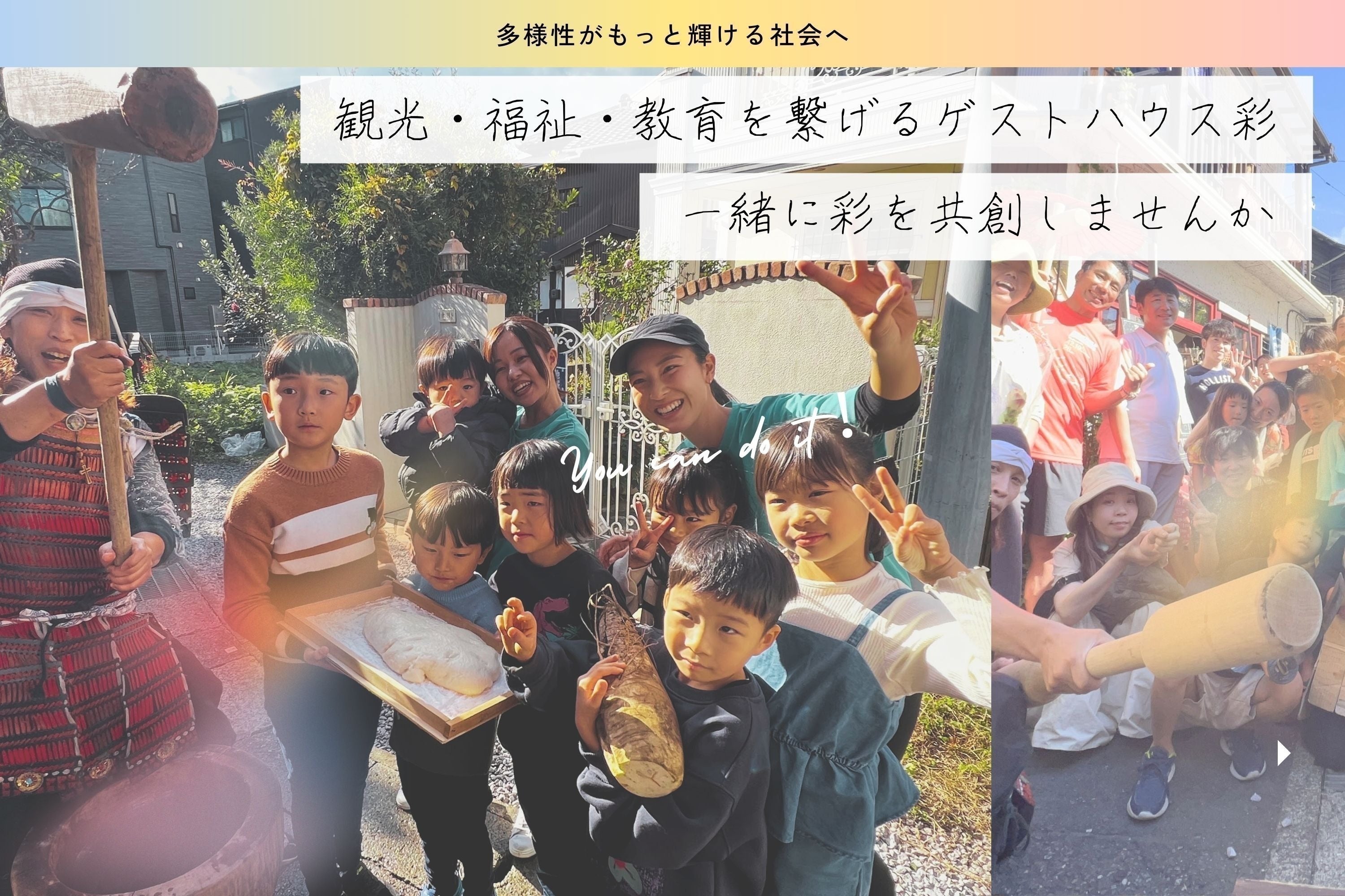 私たちは障がいがある人もない人も一緒に共創する社会を目指して、2016年より古都・鎌倉にて、車いすや盲者、聾者、年齢も様々に、社会的養護を受けている方、ヤングケアラー、高齢者など、さまざまな背景を持つ仲間たちと一緒に「ゲストハウス 彩」を運営しています。